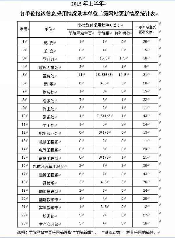2015年上半年各单位报送信息采用情况及本单位二级网站更新情况统计