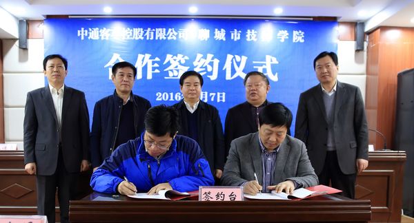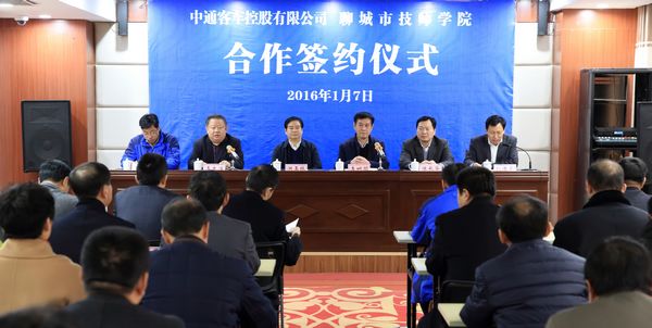 2016年1月7日,学院与中通客车控股有限公司在培训中心举行校企合作签约仪式。聊城市副市长洪玉振、市政府办公室副主任陈长华、中通客车控股有限公司董事长李树朋、中通客车控股有限公司总经理助理王传甫、学院党委书记李友渔及领导班子成员出席了仪式,仪式由学院党委副书记兼纪检书记刘德云主持。