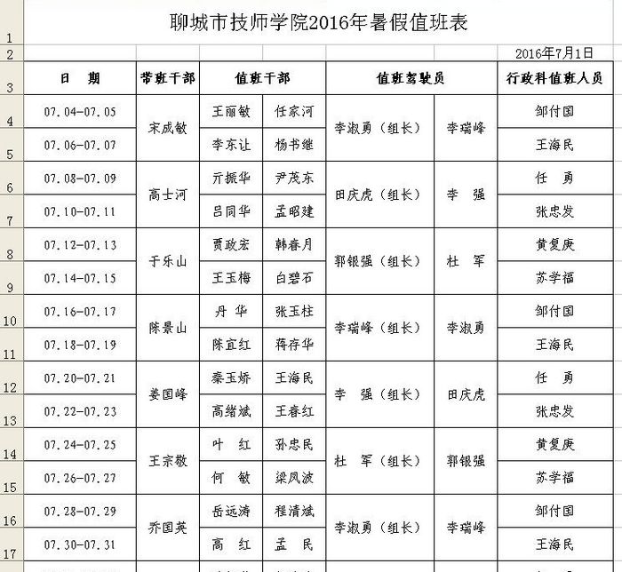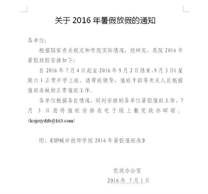 学院2016年暑假放假通知及暑假期间值班安排表