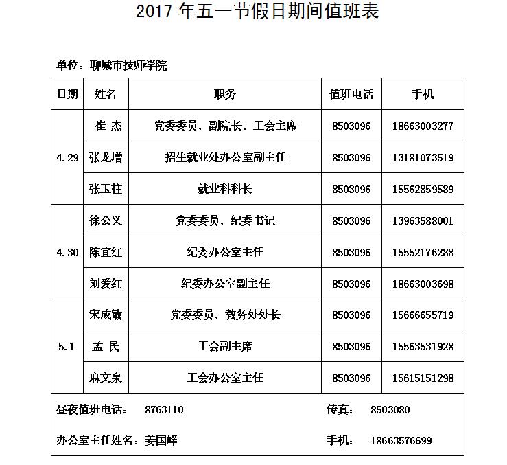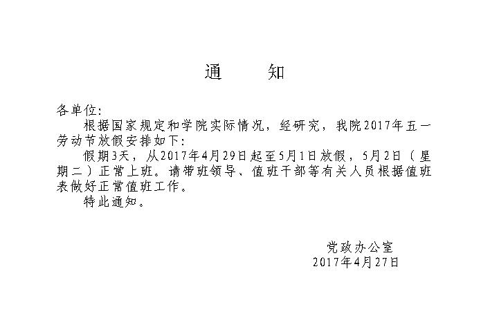 学院2017年“五一”劳动节放假通知及假日期间值班安排表