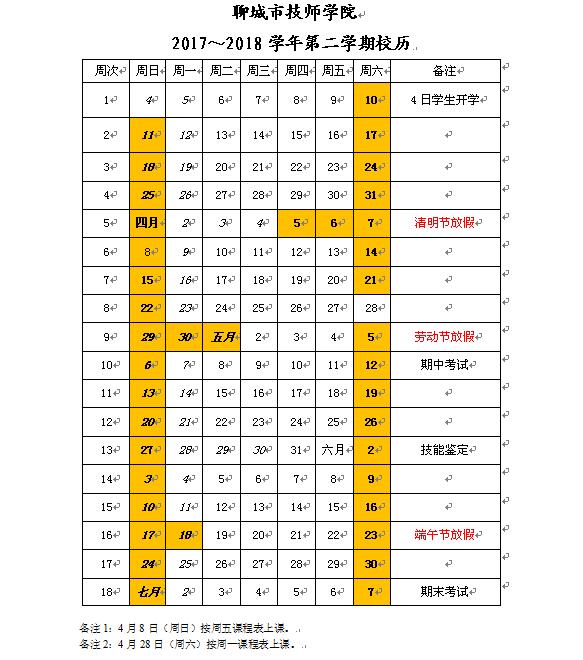 学院2017~2018学年第二学期校历
