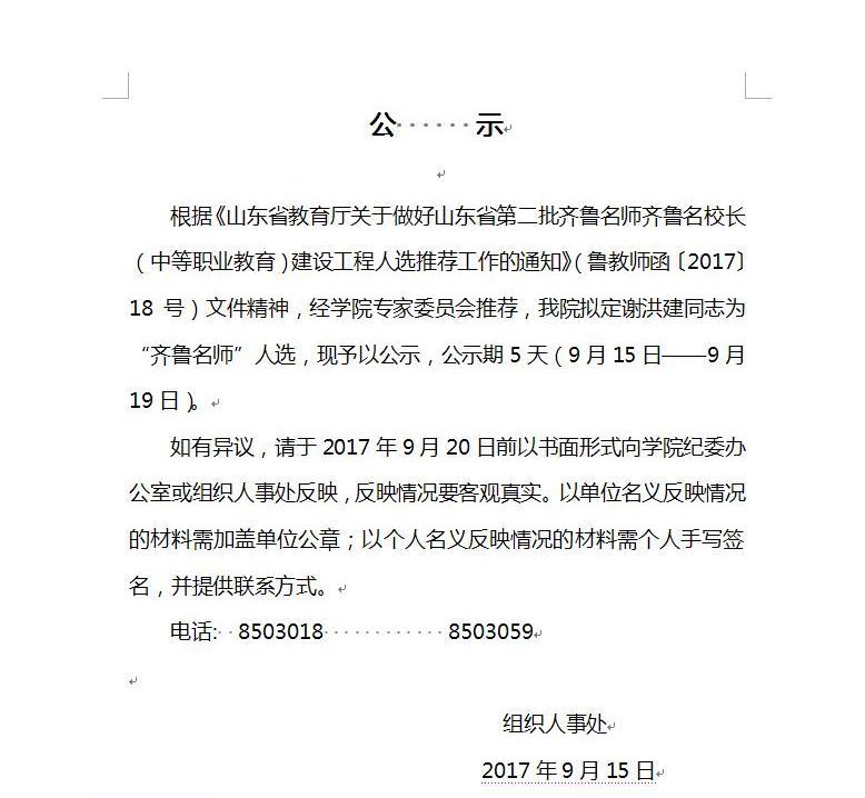 聊城市技师学院关于推荐山东省第二批齐鲁名师齐鲁名校长建设工程人选的公示