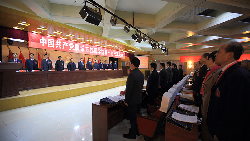 大会会场气氛隆重而热烈,与会人员精神饱满。主席台上方悬挂着“中国共产党聊城市技师学院第一次代表大会”会标,金色的党徽在中央熠熠生辉。会场悬挂着“立足新起点,谋划新发展,明确新目标,实现新跨越”的横幅。