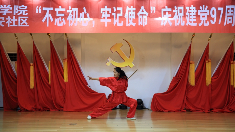 演出在《喜洋洋》欢快的音乐声中拉开序幕,由22个党支部推荐的男声独唱、歌伴舞、经典诵读、武术表演等节目轮番上演,精彩纷呈,体现了对党和祖国的无比热爱和我国辉煌业绩的赞颂。诵读《半条棉被》《谁是习近平心中的英雄》等,讴歌了伟大的长征精神,缅怀了马克思的伟大人格和历史功绩,表达了师生争做新时代英雄的坚定决心;歌曲《多情的土地》饱含着对祖国的一片深情;《大学》《论语》等经典诵读,浸润着师生对中华传统文化的理解和继承;《少年中国说》《中国梦》《家风颂》等诵读,表达了青年学子肩负起实现中华民族伟大复兴中国梦的责任担当;武术表演《精武忠魂》,展现了同学们生龙活虎、斗志昂扬的精气神;歌伴舞《再一次出发》把汇演推向了高潮,以高亢的歌声和优美的舞蹈表达了全体师生员工在中国梦的召唤下,沿着中国特色社会主义道路奋勇前进的心声……