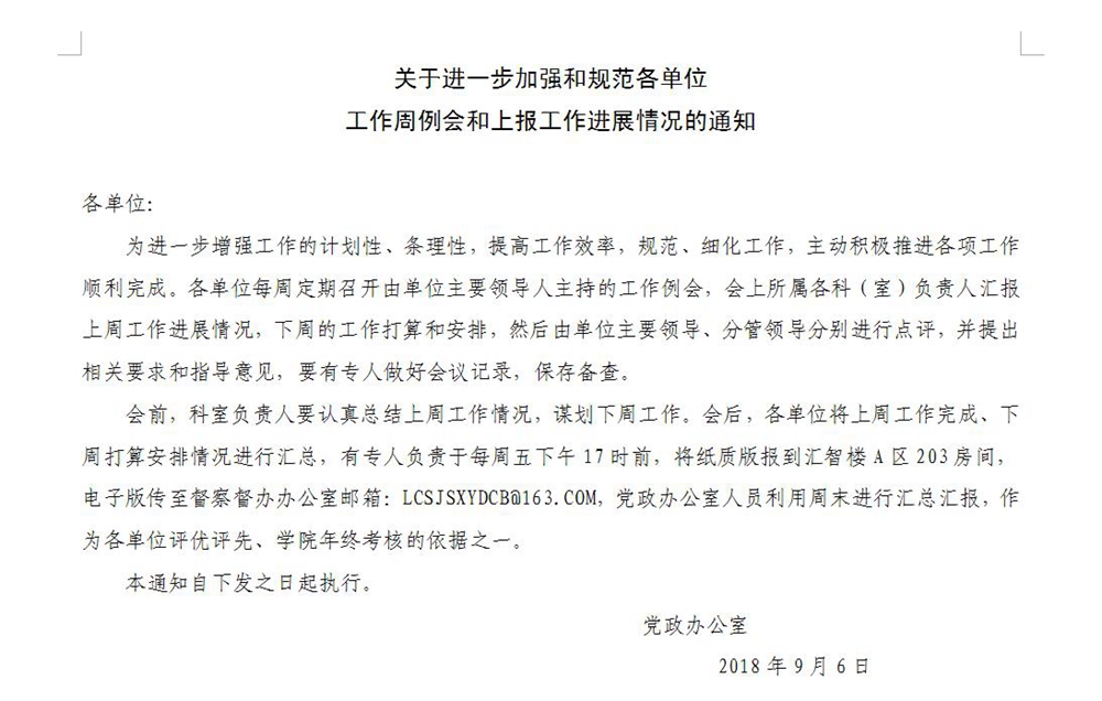 学院《关于进一步加强和规范各单位工作周例会和上报工作进展情况的通知》