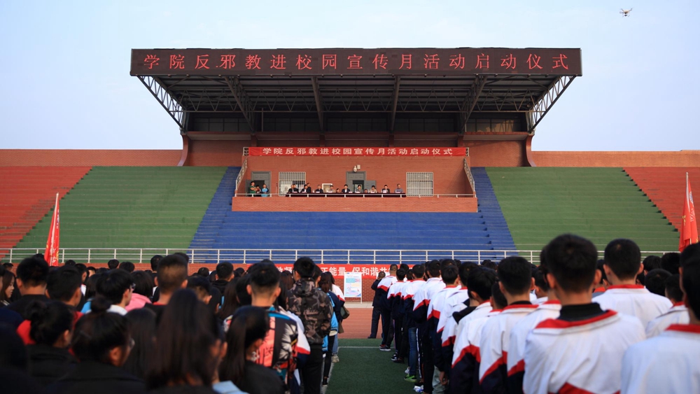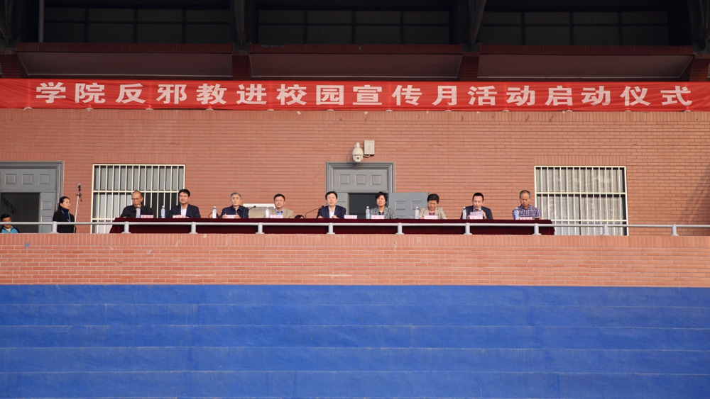 10月22日,学院在体育场隆重举行反邪教进校园宣传月活动启动仪式。学院党委副书记、院长刘德云,聊城高新区党工委副书记徐霞,市公安局国保支队支队长李顺峰,市教育局副县级督学郝晓萍,学院党委委员、副院长纪光泽、崔杰,党委委员、教务处处长宋成敏,党委委员、院长助理、党政办公室主任姜国峰,院长助理、宣传处处长王宗敬,各教学系主任及学生科人员,宣传处、团委学工处、保卫处全体人员,全体班主任和学院全体学生参加了仪式。活动由崔杰主持。