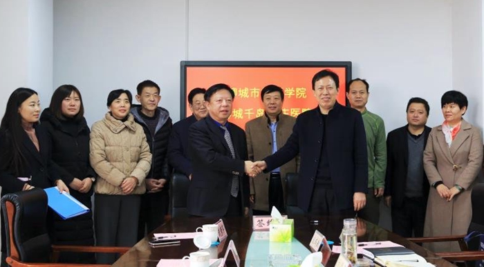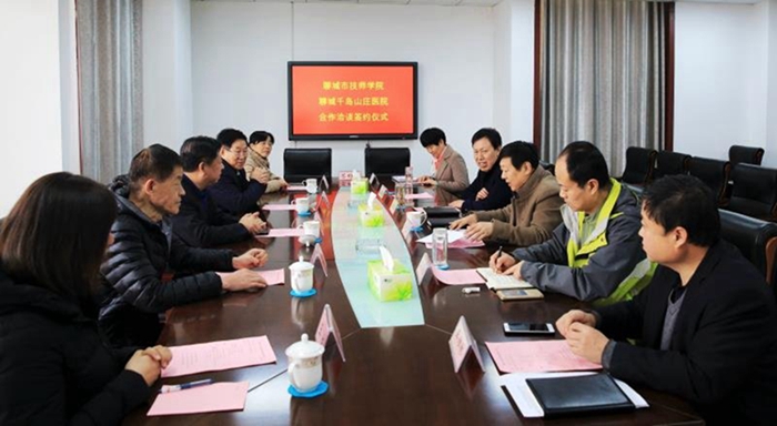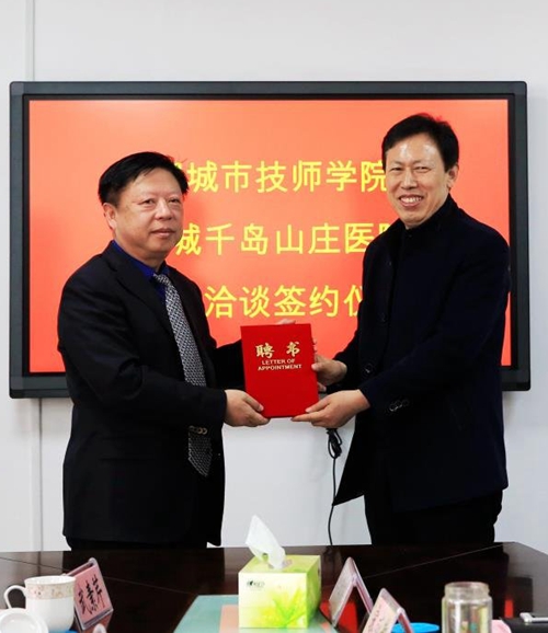 1月29日,在学院汇智楼六楼会议室,我院与聊城千岛山庄医院洽谈签约。学院党委副书记、院长刘德云与聊城千岛山庄医院党委书记、院长张洪军分别代表双方签订校企合作协议,成立聊城市技师学院千岛山庄康养医院。仪式上,聘任张洪军为学院客座教授并颁发了聘书。
