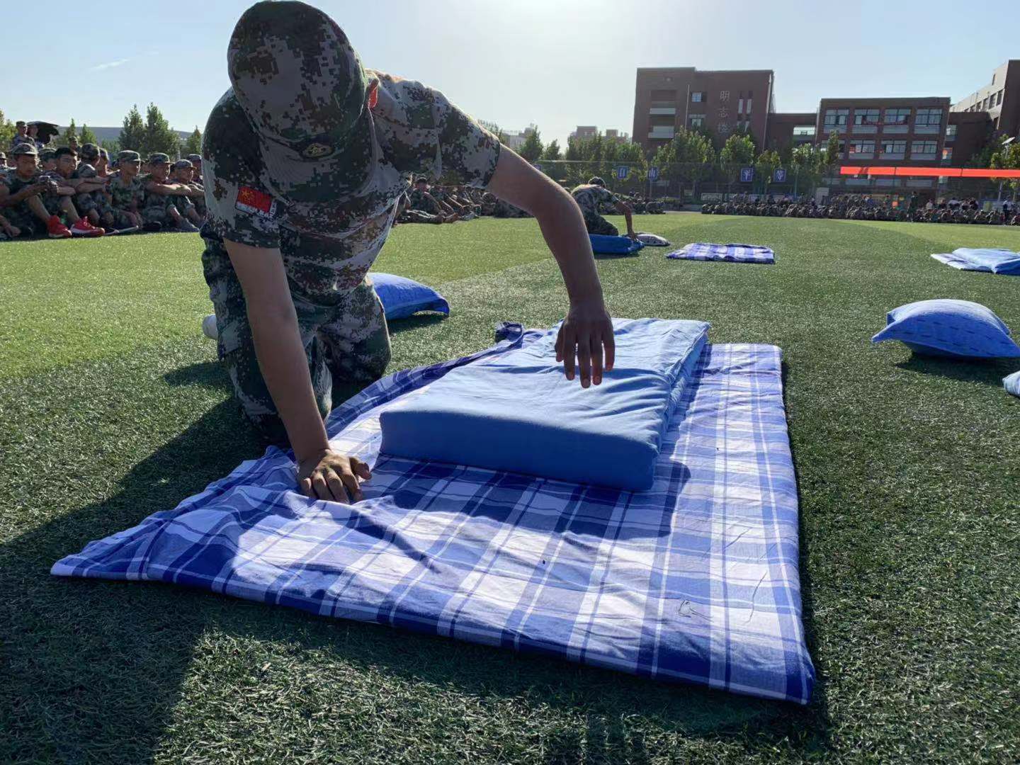 嘹亮的歌声还在耳边回荡,紧接着内务比赛又拉开了序幕。教官首先宣读了本次比赛的规则,各连队分别指派两名学生带着被子进入比赛场地。随着教官一声令下,军训内务比赛正式开始,场面蔚为壮观。比赛中,同学认真地对待叠被子的每一个细节。伴随着同学们震天动地的加油声,参赛选手们不慌不乱,手脚麻利地铺平、压实、翻折、抠角、捏线,动作一气呵成。一个个整齐的“豆腐块”被子呈现在操场上。经过紧张激烈的比拼,最终我系大专数控班的李泽军摘得桂冠,焊接班的许士状、褚天亮荣获二等奖。