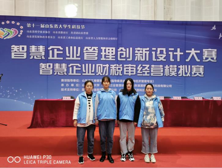 10月27日,由山东省科协、省教育厅、团省委、省发改委、省工信厅、省人社厅联合主办的第十一届山东省大学生科技节——智慧企业管理创新设计大赛智慧企业财税审经营模拟赛,在山东财经大学举行。17级会计专业参赛选手杨青燕、徐英真、杨旭、李雪静,在蔡莉、龚瑞老师的具体指导下 ,我院代表队在中职组23支代表队中脱颖而出,荣获第七名的好成绩。
