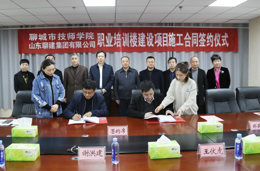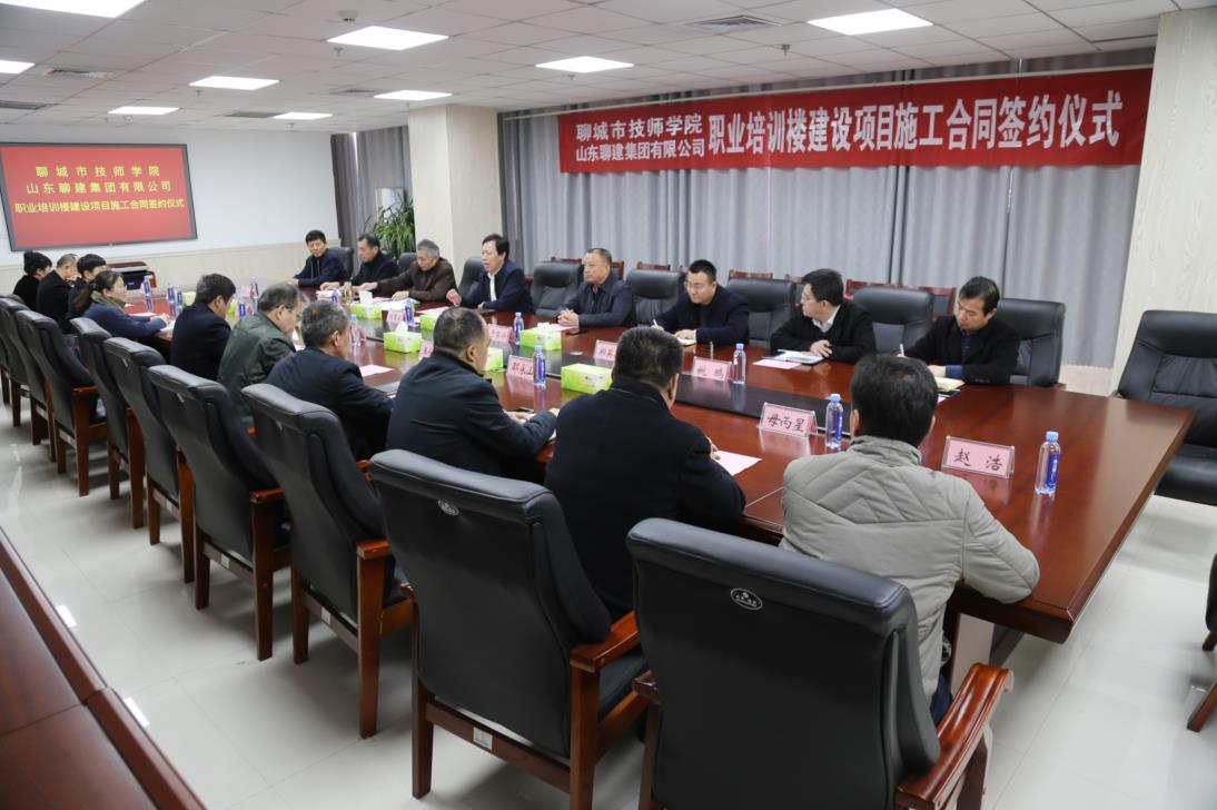 12月14日上午,在学院汇智楼六楼会议室,聊城市技师学院与山东聊建集团有限公司就职业培训楼项目建设施工合同举行签约仪式。