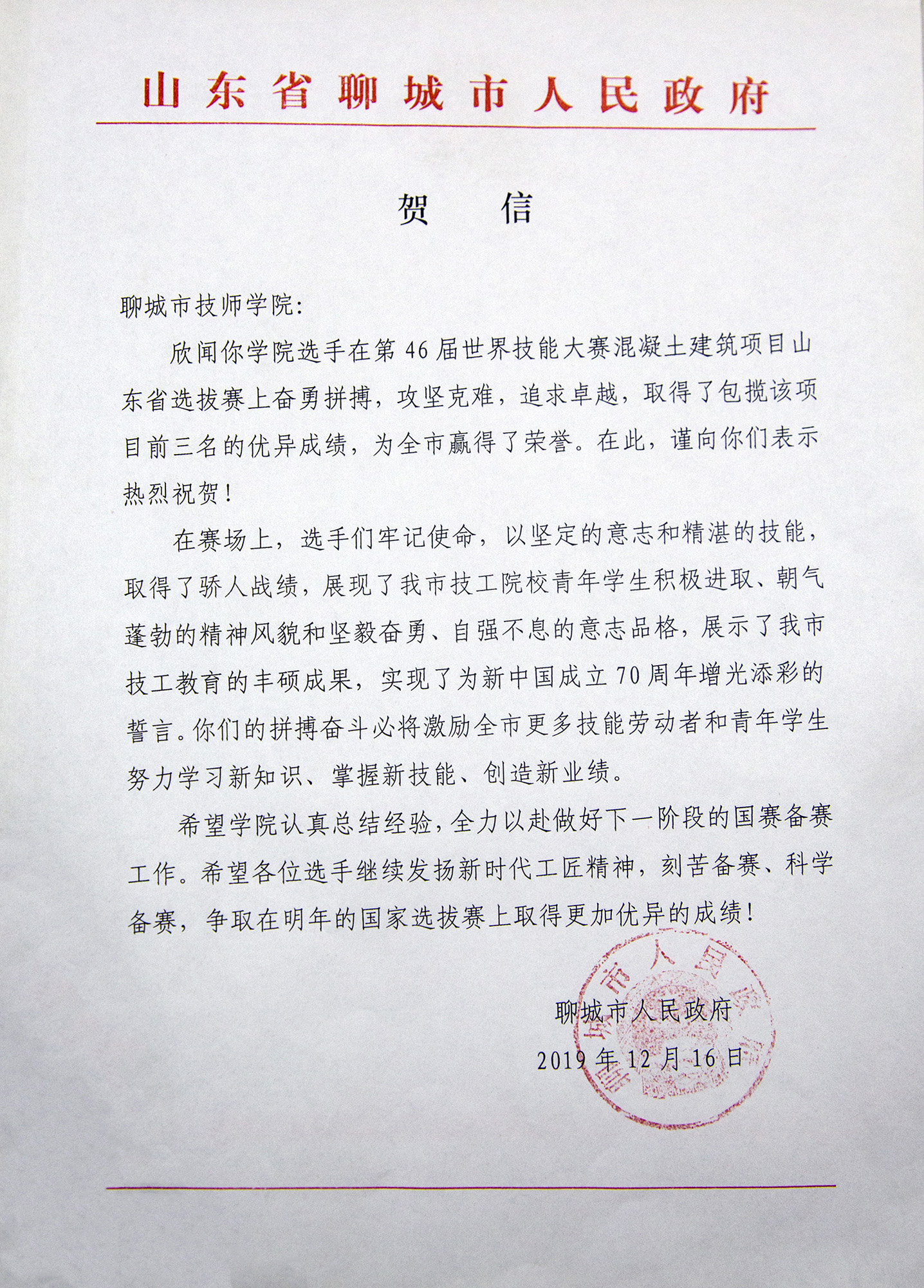 12月16日,市政府发来贺信,对我院在第46届世界技能大赛混凝土建筑项目山东省选拔赛上所取得的成绩表示祝贺。