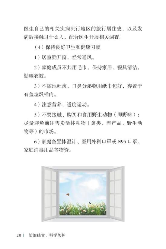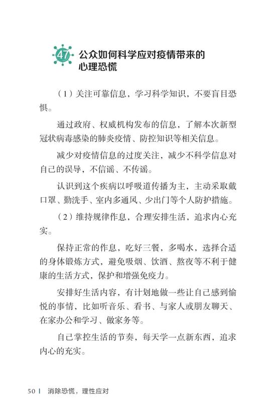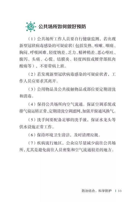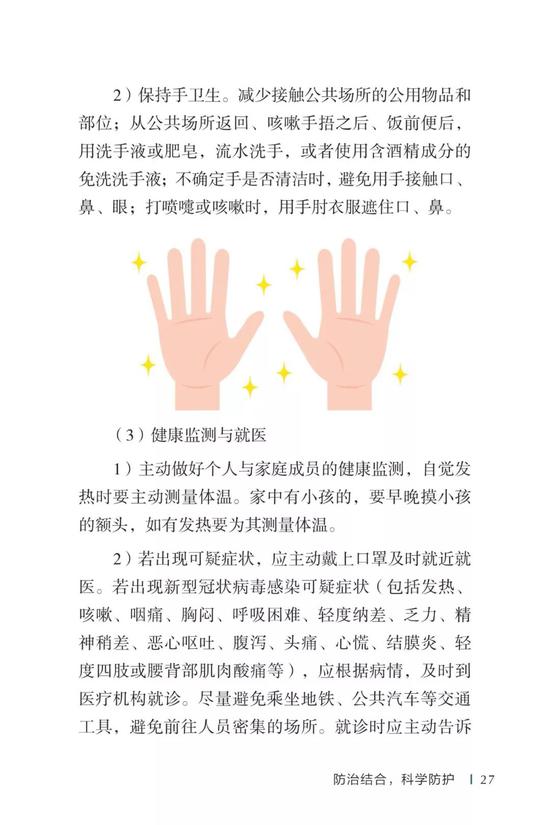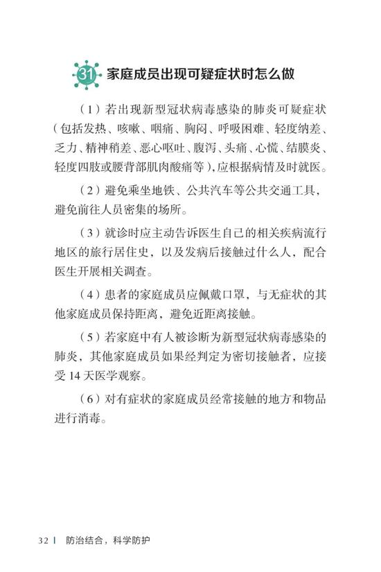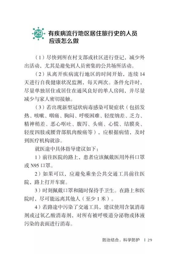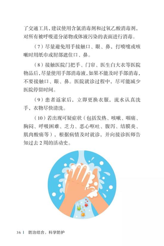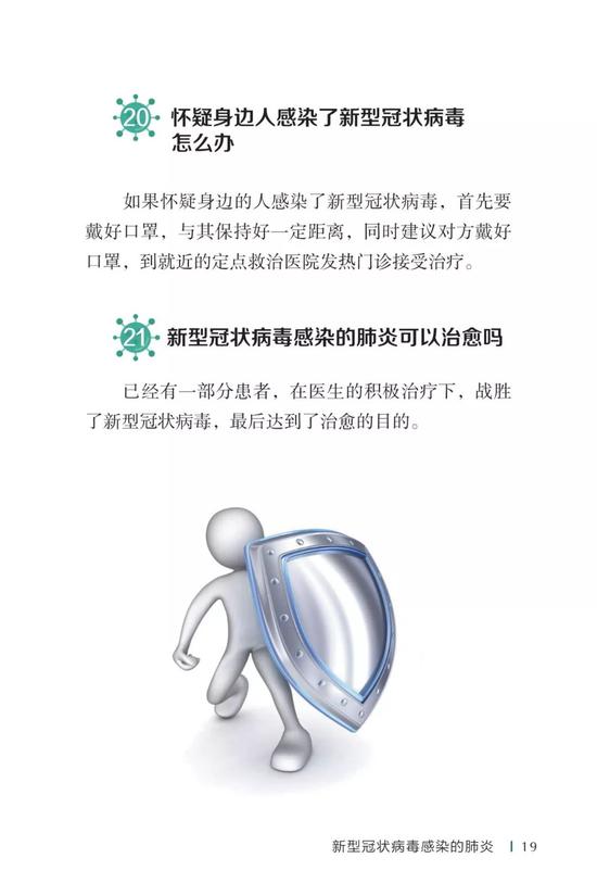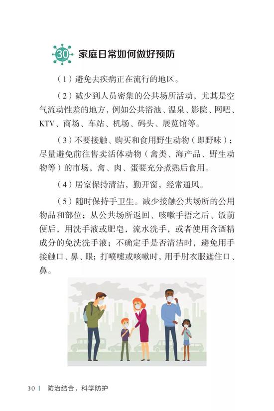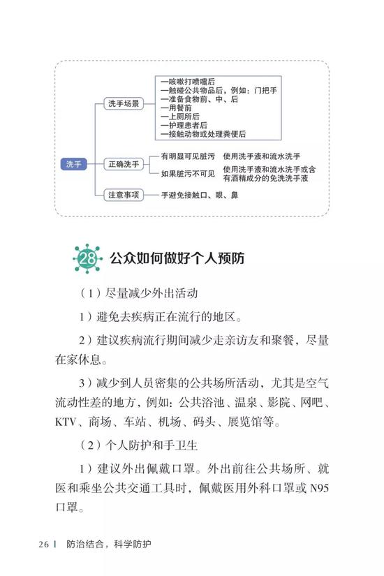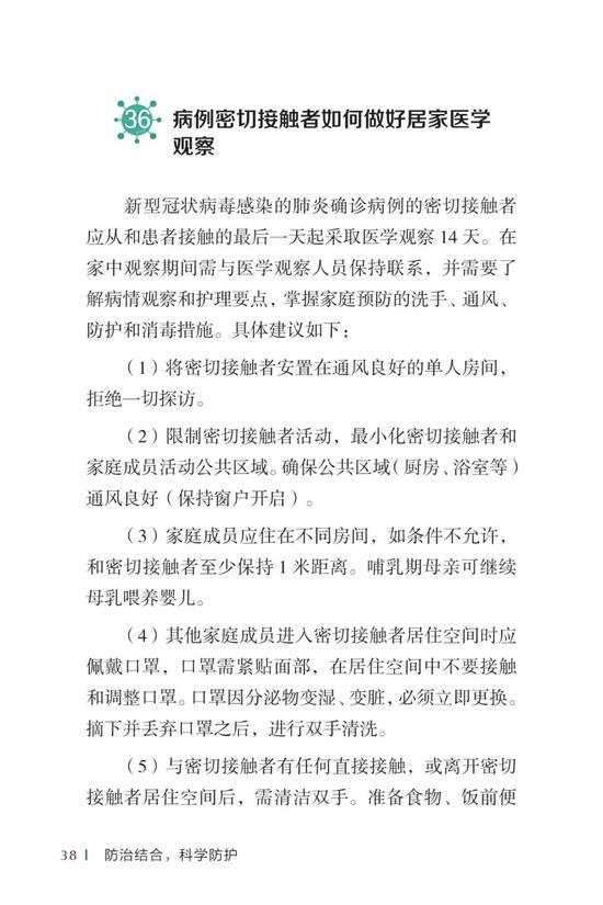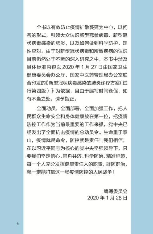 中国疾病预防控制中心编写的《新型冠状病毒感染的肺炎公众防护指南》,日前出版发行。此书聚焦公众个人与家庭防护、居家医学观察、理性就医、心理疏导等防治细节,通过问答形式解读新型冠状病毒感染的肺炎有关问题疑惑,引导公众正确认识,积极做到防治结合、科学防护、消除恐慌、理性应对。此书包括图书、电子书、网络版读物等多种形式,第一批图书已紧急送往武汉抗击疫情第一线,电子书、网络版读物在学习强国、健康中国、人卫健康、掌阅等多个网络平台、微信公众号公益传播,并为全国各地提供可印制的PDF版本。