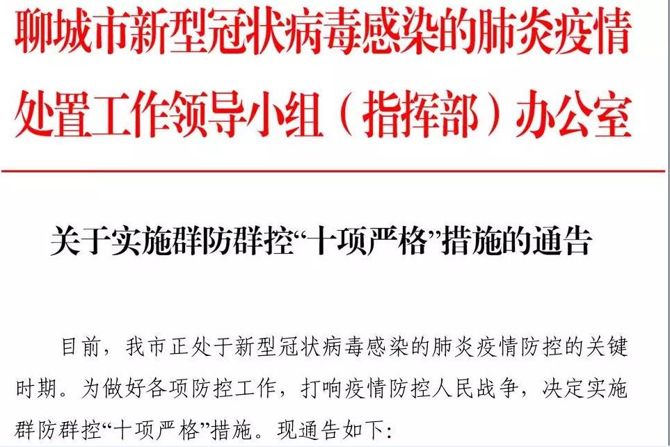 六、严格实行报告制度。居民如出现发热、咳嗽等症状,及时到定点医院发热门诊就诊,并第一时间报告社区、村庄、单位。省外返回和来聊人员一律在1小时内主动向居住地社区(村)报告。广大群众发现疫情高发地区来聊人员故意瞒报的,应及时通过12345、110热线举报。