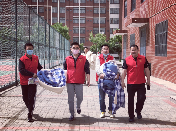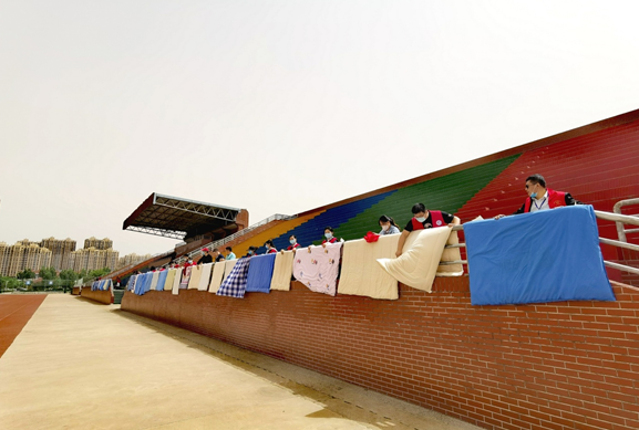 5月12日上午,风和日丽。学生工作处工作人员,各系全体班主任、学管人员、物业值班人员纷纷来到学生公寓区。大家对各宿舍学生被褥分别做好标记,一一搬至预先划分好的相应区域进行晾晒。