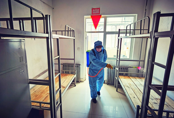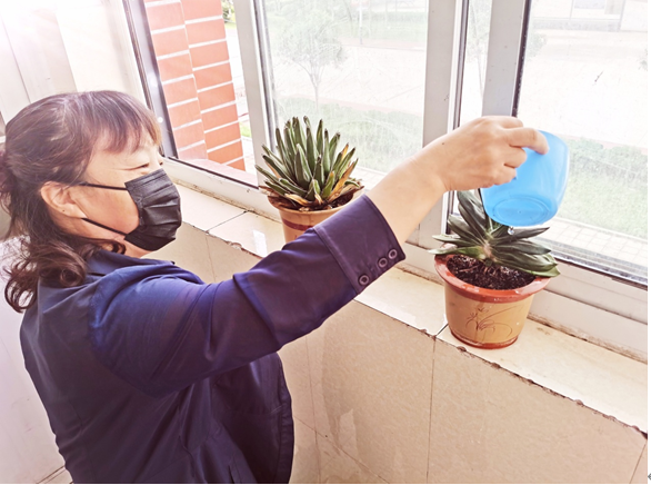 随后,他们又将学生宿舍门窗全部打开通风。不仅如此,教职工们还当起了清洁工,将宿舍和走廊打扫得干干净净,甚至,施肥浇花的活儿也被各班班主任全部包揽。下午,室外晾晒的被褥又被收拾起来放回原位。在将宿舍门窗关好后,物业消杀人员又对每间宿舍进行消毒。活动中,所有参与人员认真负责,做事有条有理,整个宿舍区飘散着一片温馨。