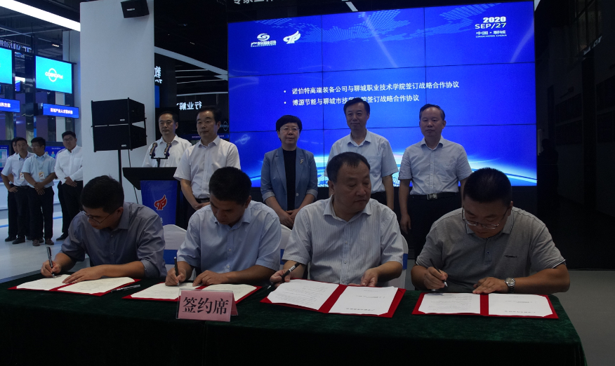活动现场,聊城市技师学院与聊城市博源节能科技公司,聊城职业技术学院与山东诺伯特智能装备公司签订了战略合作协议。
