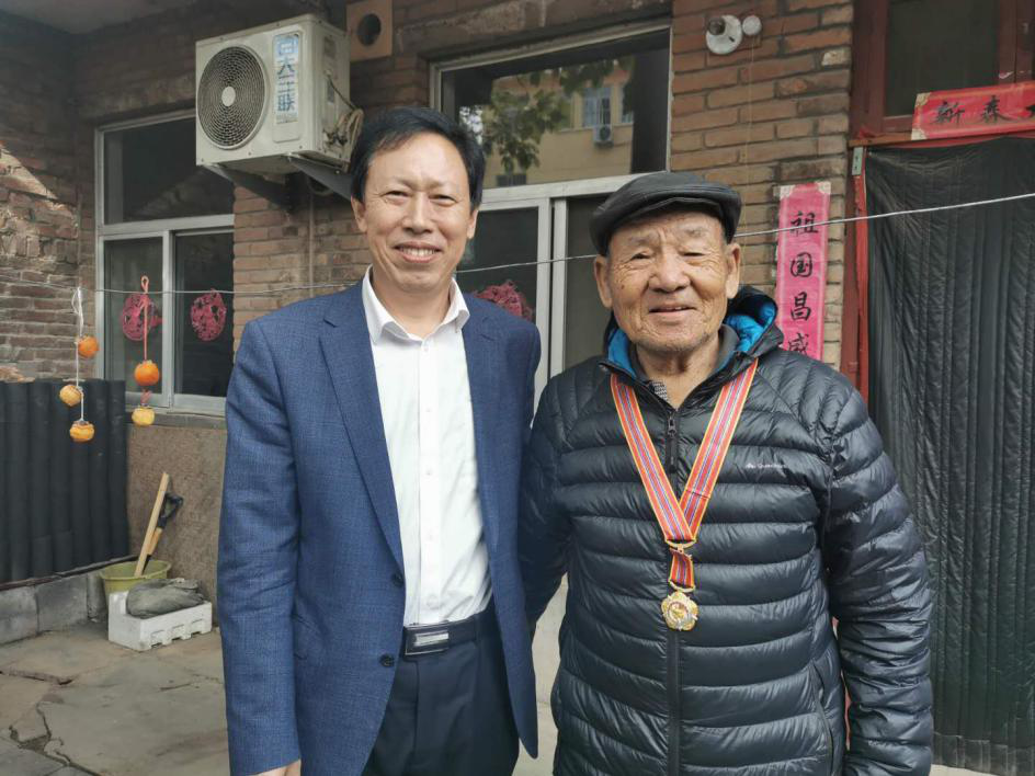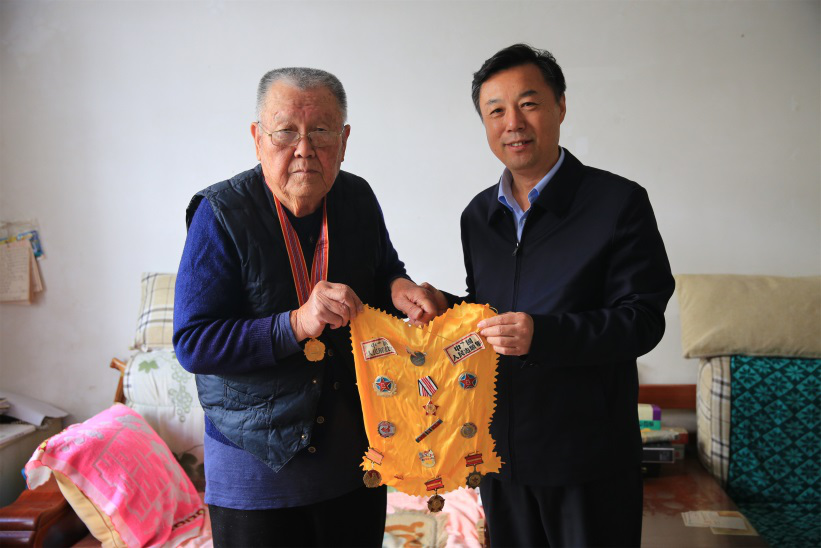 在离休老干部许世昌同志家中,张连臣书记亲手为许老佩戴上了“中国人民志愿军抗美援朝出国作战70周年”纪念章。许世昌同志表示非常感谢党和国家的关心,感谢学院党委对自己的照顾,他动情地说:“今天为我颁发的纪念章是由众多烈士的鲜血和汗水凝聚成的,是所有革命志士的生命换来的,我要好好珍惜党和国家给予的崇高荣誉,感谢党和国家没有忘记我们这些老同志。”他将自己珍存的在战争时期获得的军功章展示给大家,同时深情讲述了自己在抗美援朝战争中英勇杀敌的峥嵘岁月。张连臣同志表示,学院发展所取得的成绩,离不开老干部在不同时期做出的积极贡献,希望他保持积极乐观的心态,祝愿他健康长寿、晚年幸福,同时嘱咐组织人事处老干部科工作人员要尽心尽力为老干部解决生活中遇到的实际困难,全力做好老干部服务工作。