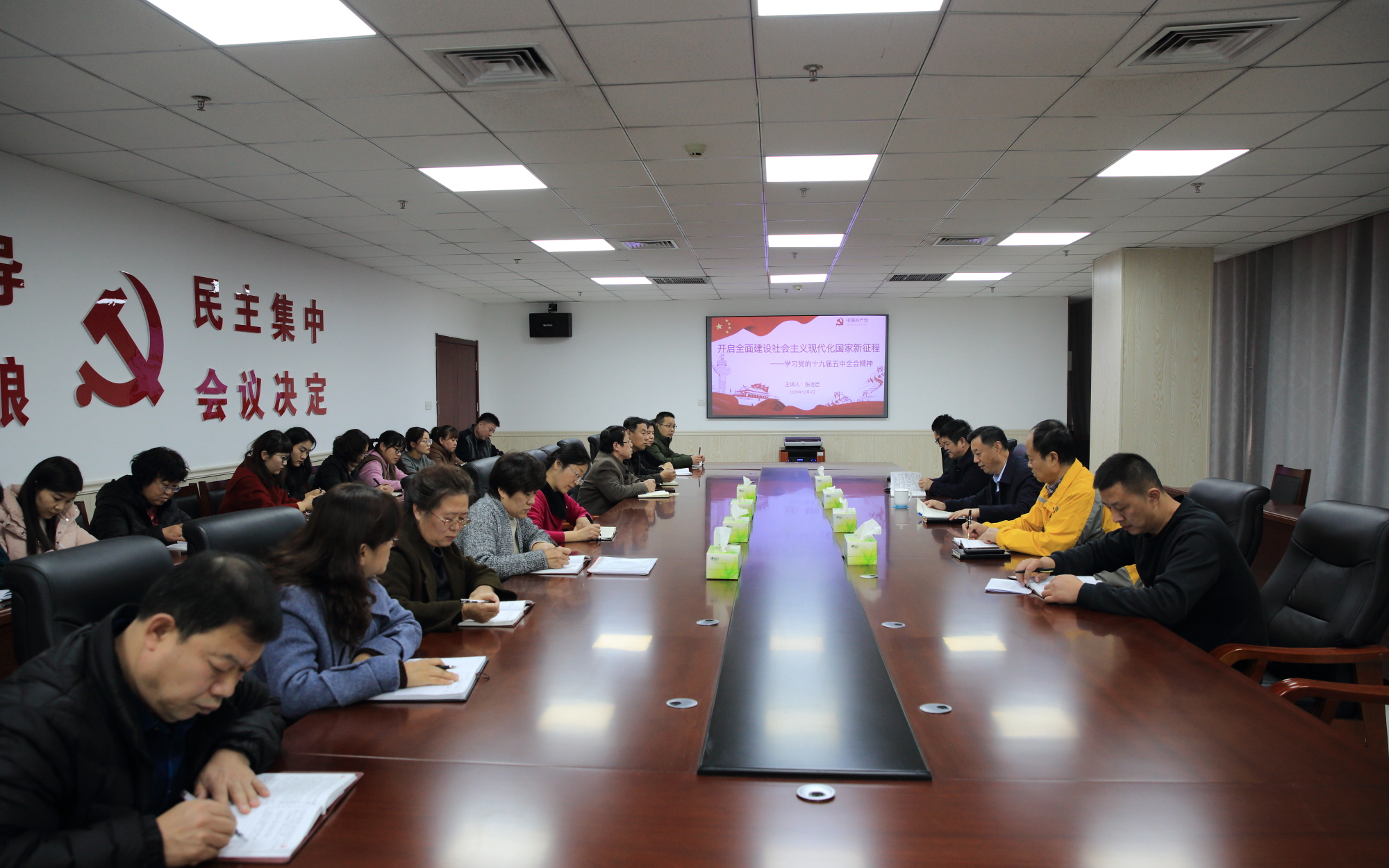 12月4日下午,学院党委书记张连臣,在汇智楼C603会议室为学院办公室、院纪委、组织人事处、宣传处党支部全体党员及积极分子上党课,宣讲党的十九届五中全会精神。