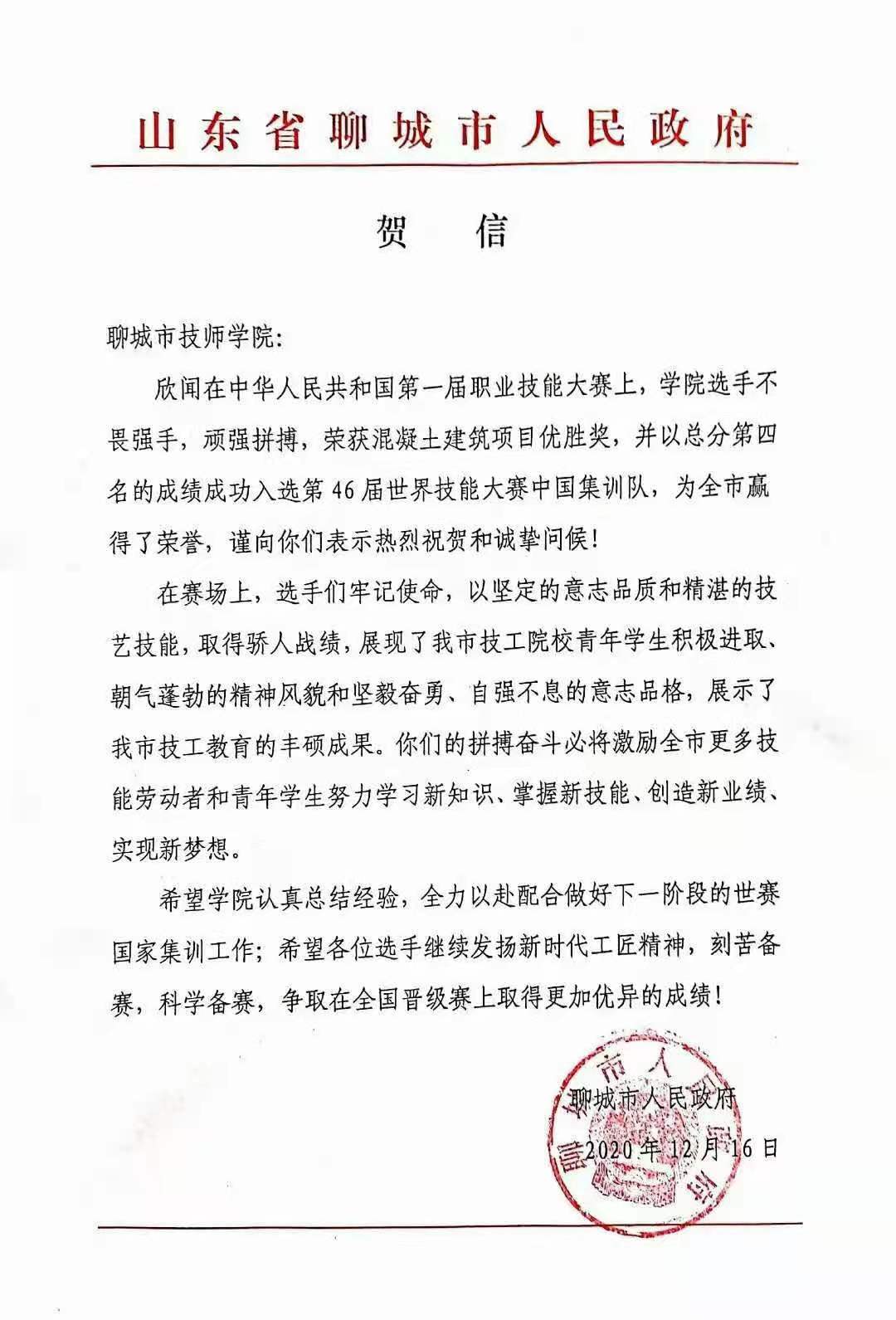 近日,聊城市人民政府向学院发来贺信,祝贺学院在第一届全国职业技能大赛喜获佳绩。贺信指出:欣闻在中华人民共和国第一届职业技能大赛上,学院选手不畏强手,顽强拼搏,荣获混凝土建筑项目优胜奖,并以总分第四名的成绩成功入选第46届世界技能大赛中国集训队,为全市赢得了荣誉,谨向你们表示热烈祝贺和诚挚问候!