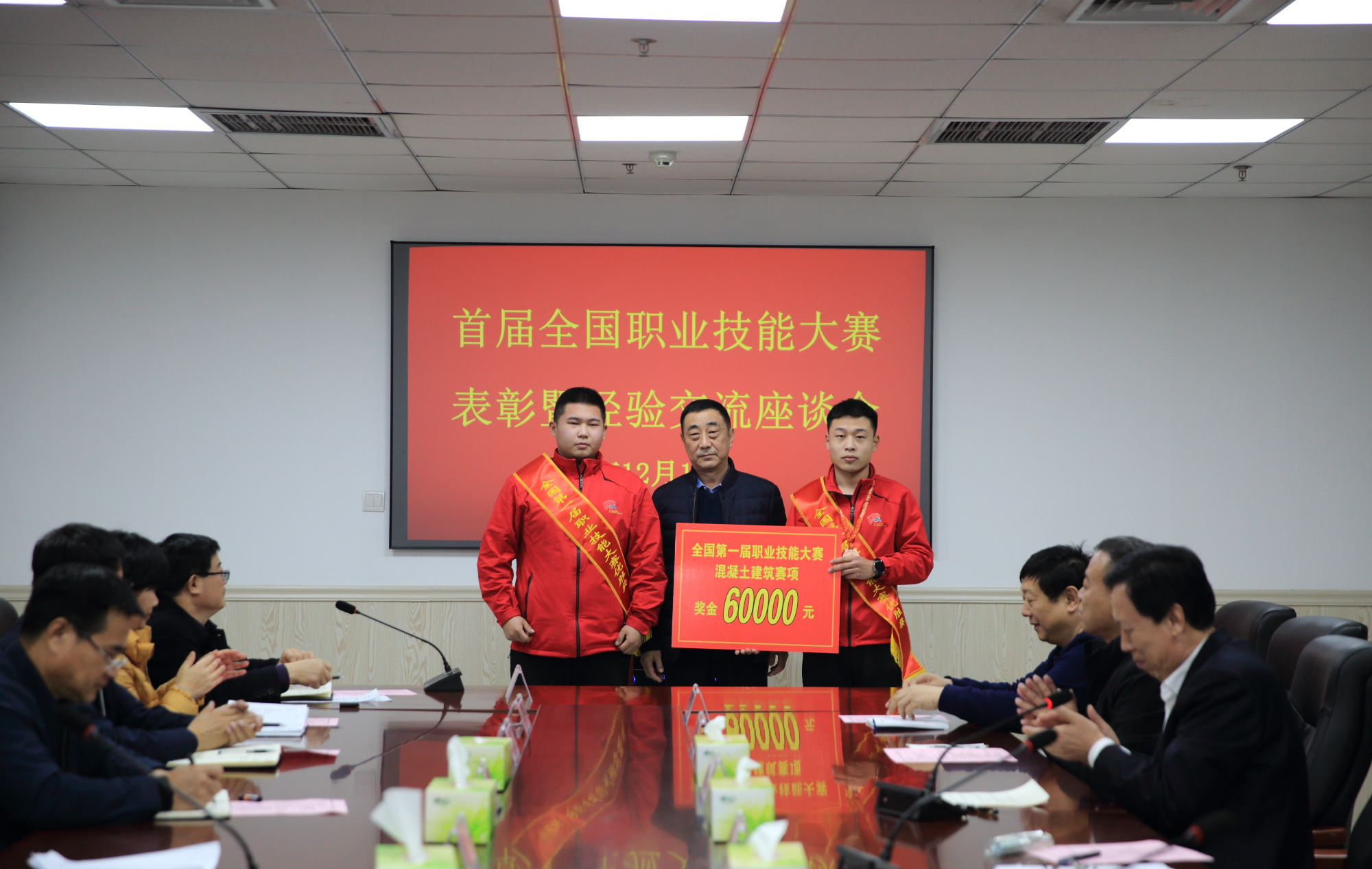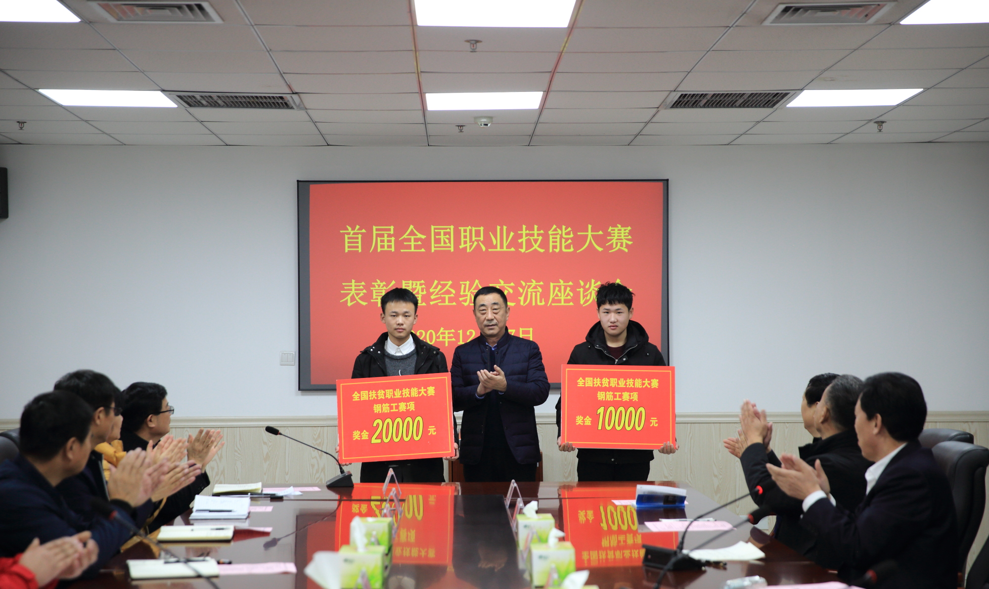 杜新亭为获奖师生颁发奖金:全国技能扶贫大赛获奖师生奖金4万元,全国职业技能大赛获奖师生奖金6万元。