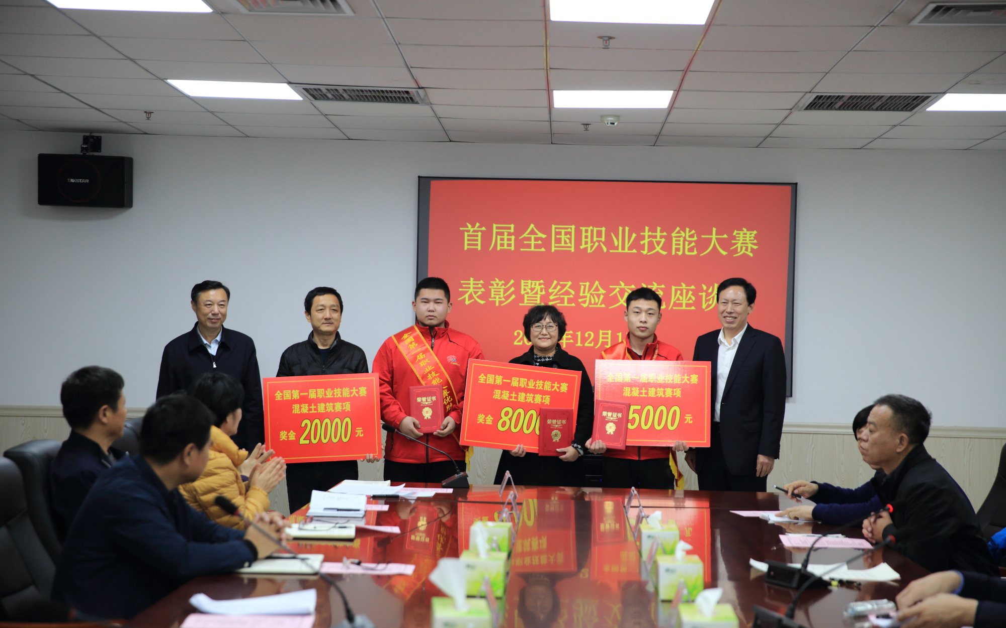 学院党委副书记徐公义宣读了学院表彰决定。院长刘德云为全国职业技能大赛获奖师生颁发证书及奖金1.3万元;党委书记张连臣为全国职业技能大赛获奖系部颁发荣誉称号及奖金2万元。