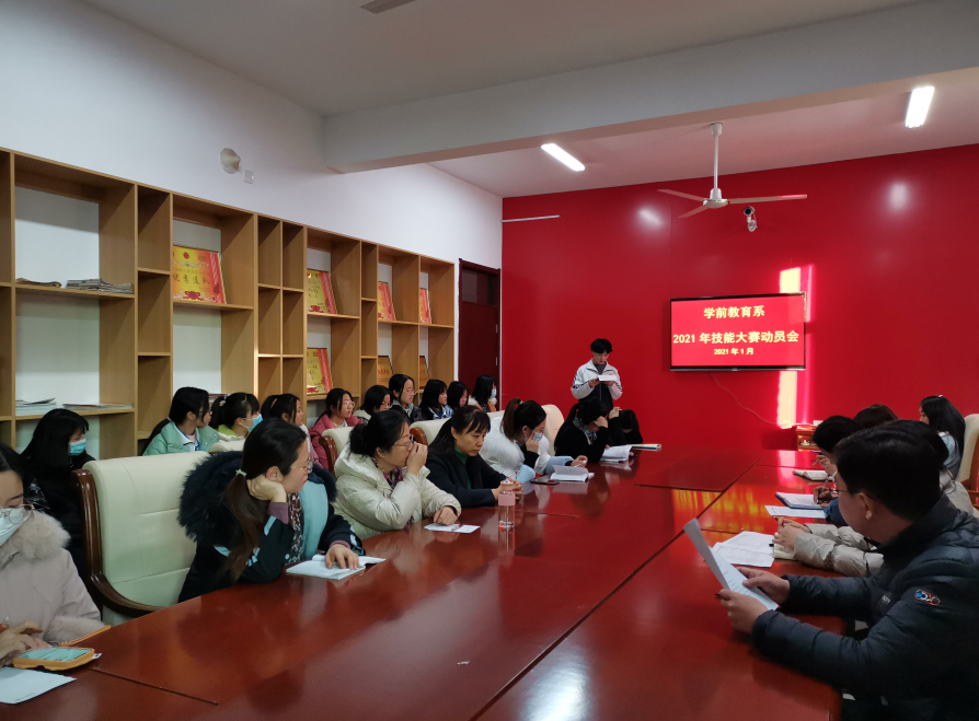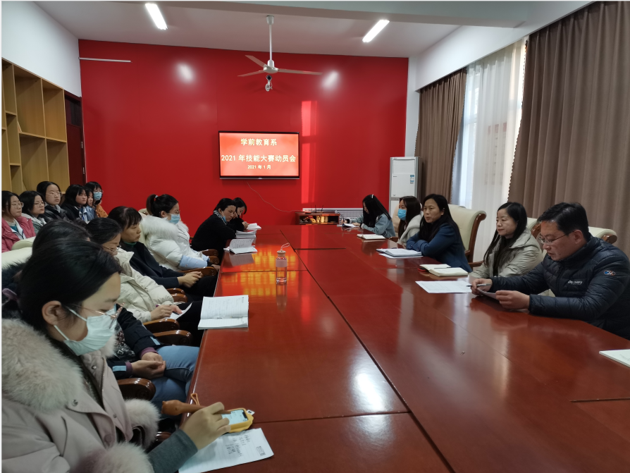 为更好备战2021年技能大赛,1月9日,学前教育系召开2021年技能大赛动员会,学前教育系主任王春红,副主任梁晓丽,教学科及指导教师,参赛学生参加会议,学前教育系2021年技能大赛训练工作正式启动。