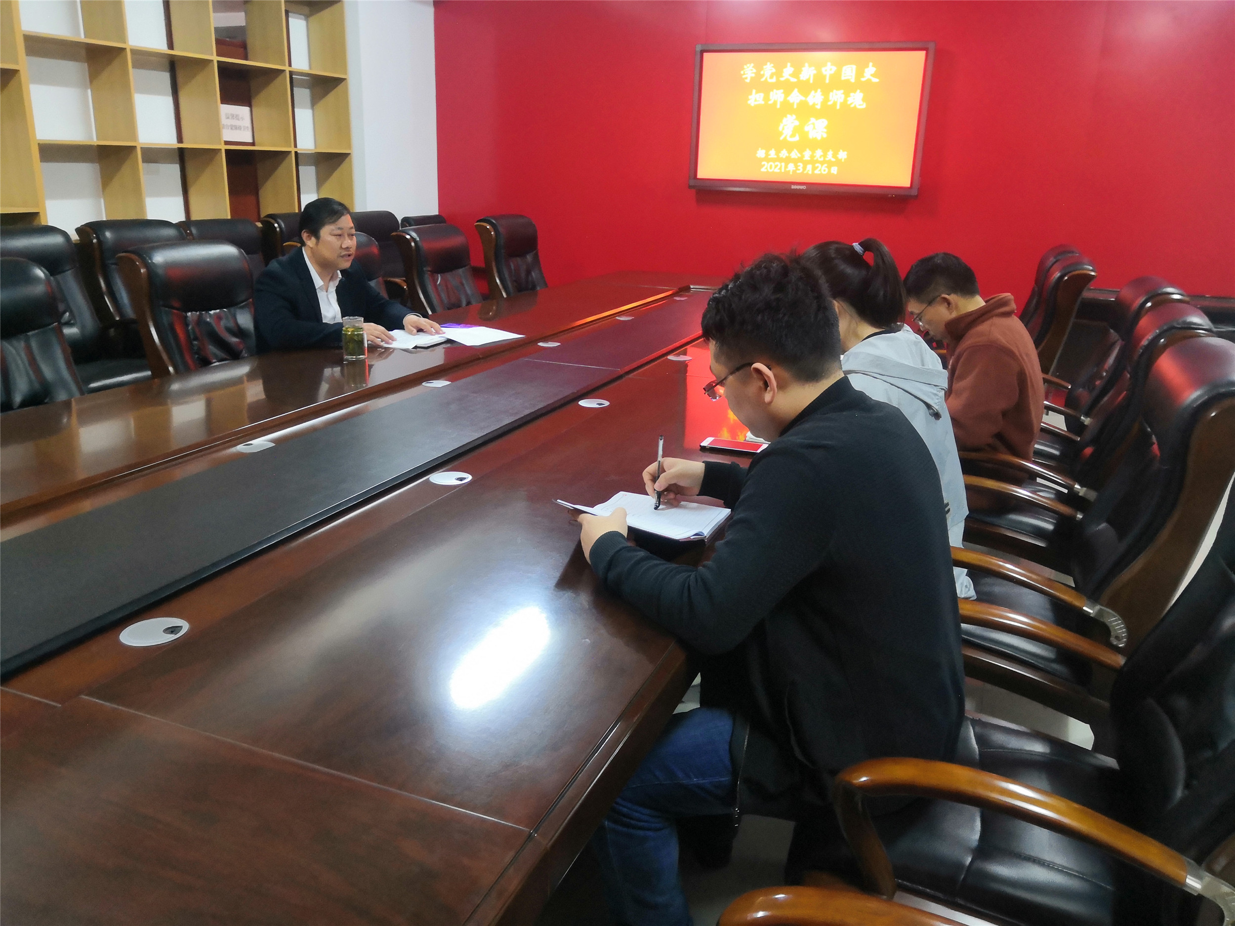3月26日下午,招生办公室党支部书记王庆刚为本处室全体同志上党课,党课以学习改革开放40年来,党领导全国人民创造的一系列“中国奇迹”、关键是党的坚强领导核心、党在新时期的重要理论成果为主,联系部门工作实际,就学院高质量发展重点工作任务、工作作风,如何创造学院发展新辉煌做了题为“学党史,担师命,铸师魂”的党课。