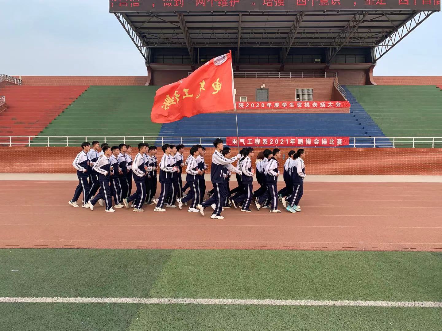 “激情飞扬、超越梦想;挑战极限、创造辉煌”、“搏击长空、翱翔万里;追求梦想、永不放弃”、“艰难困苦、 风雨无阻;亦文亦武、共展宏图”、“厚德载物、自强不息;团结进取、永争第一”……口号声一浪高过一浪,此起彼伏,震耳欲聋。没错,它们正来自于电气工程系跑操比赛的火热现场。