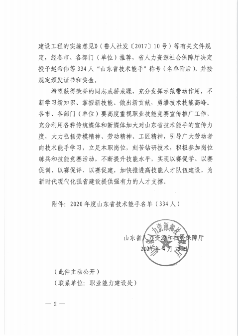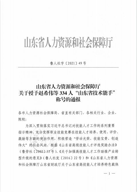 4月12日,山东省人力资源和社会保障厅发文通报表彰一批“山东省技术能手”。我院教师崔维海、王健,学生谷士财、王青博榜上有名。