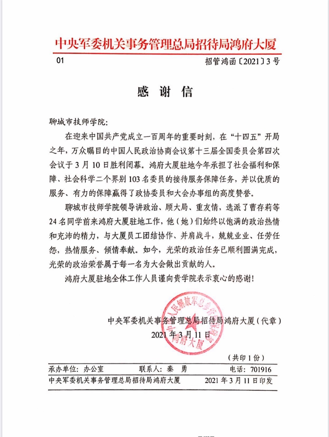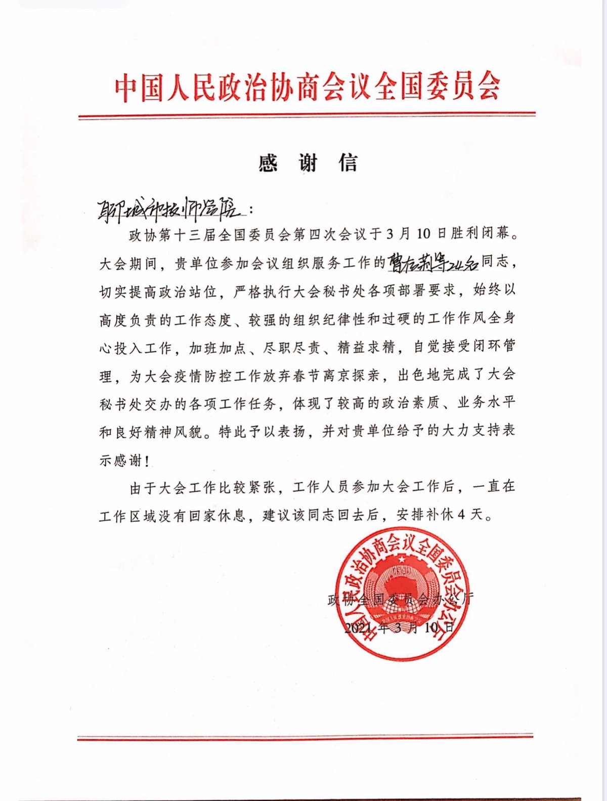 这是我院学生服务两会以来,第二次荣获全国政治协商委员会办公厅赠送的感谢信和锦旗,大厦领导代表全国政协办公厅对我院实习学生在工作期间所表现出的讲政治、守纪律,团结有为、奋发进取的政治素质和工作作风给予充分肯定,对他们在全国政协十三届三、四次会议服务和参加“193”重点演训任务中出色的工作表现给予高度赞扬。
