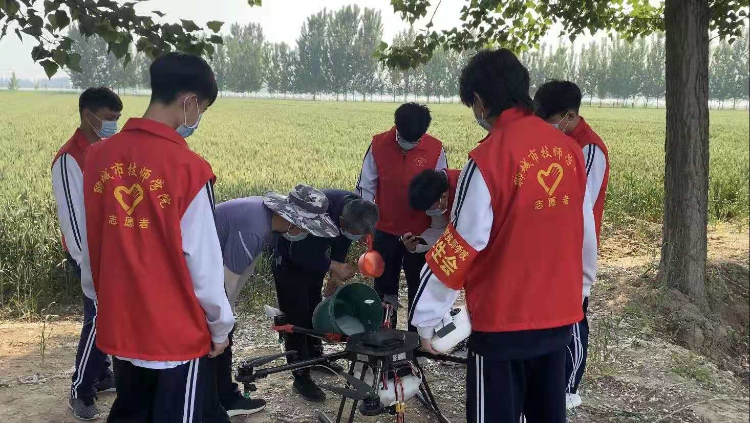 5月12日下午,信息工程系无人机操控专业的同学们,在任课老师贾天洪和柴守立的带领下,来到茌平区韩集镇沙杨村的麦田,操纵植保无人机实地喷洒农药,开展实操教学,麦田地头成了实操课堂。