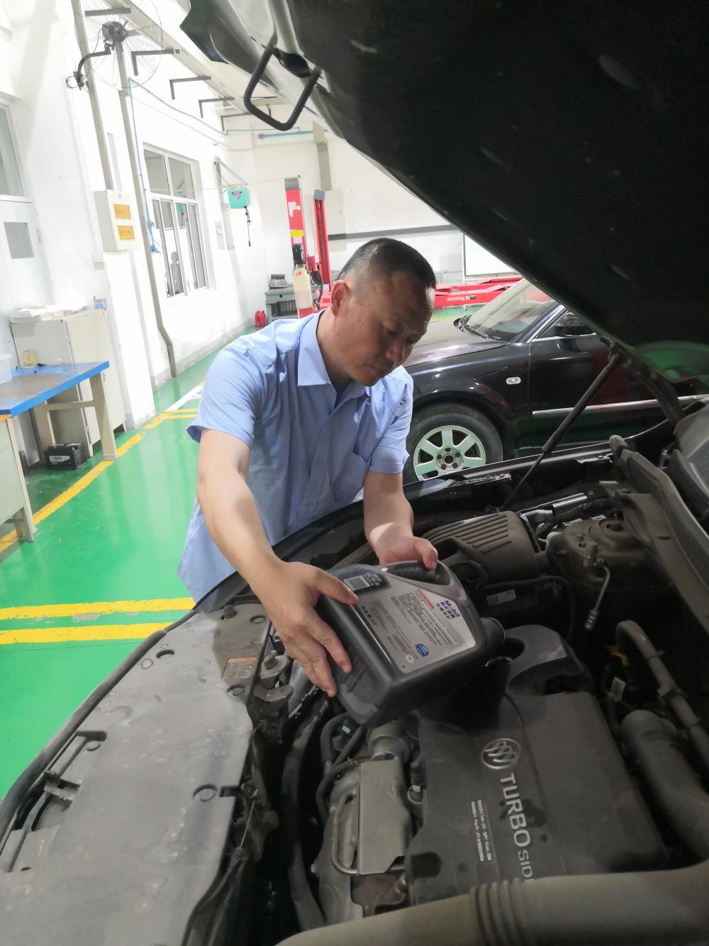 汽车保养过程中,负责保养的专业教师和学生们一丝不苟、精益求精,严格按照操作流程及规范进行作业,更换“三滤”、加注机油、胎压监测,汽车在保养团队的精心呵护下焕然一新。