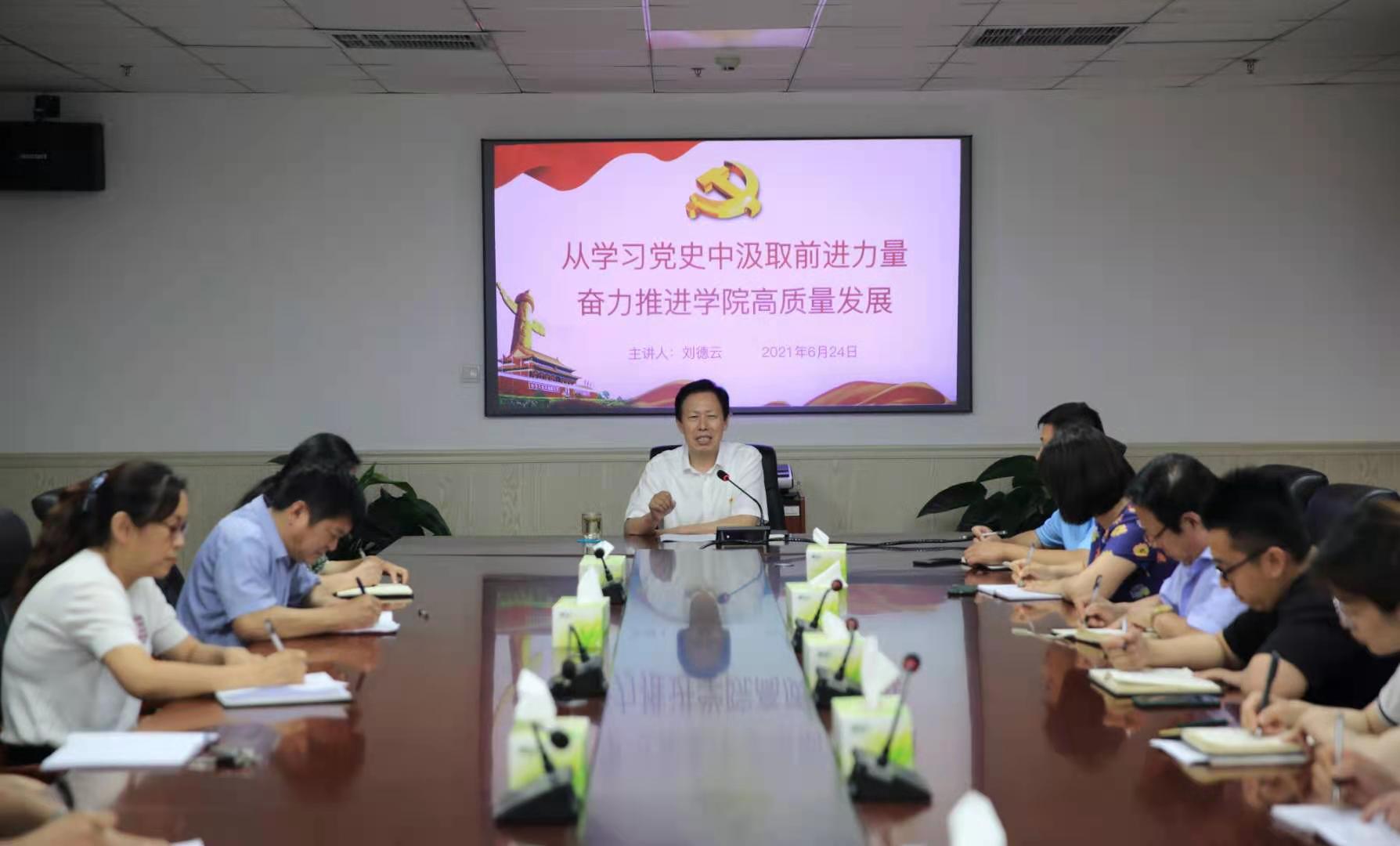 为庆祝中国共产党成立100周年,深入推进党史学习教育,6月24日下午,学院党委副书记、院长刘德云以《从学习党史中汲取前进力量 奋力推进学院高质量发展》为题,从深刻认识开展党史学习教育的重大意义,着力提高党史学习教育成效、推动学院高质量发展两个方面为学院办公室党支部、组织人事处党支部、宣传处党支部全体党员、预备党员及积极分子上了一堂专题党课。
