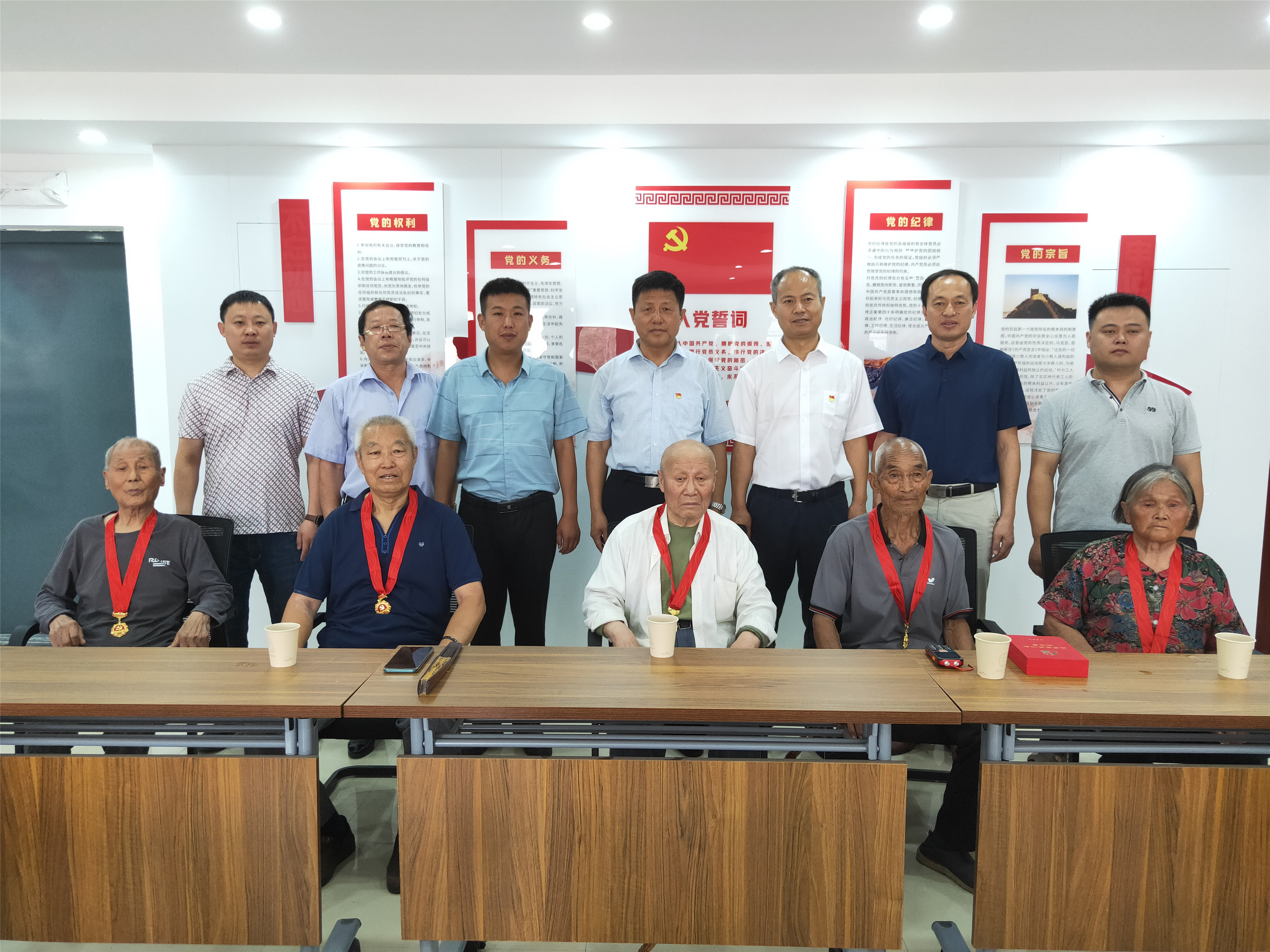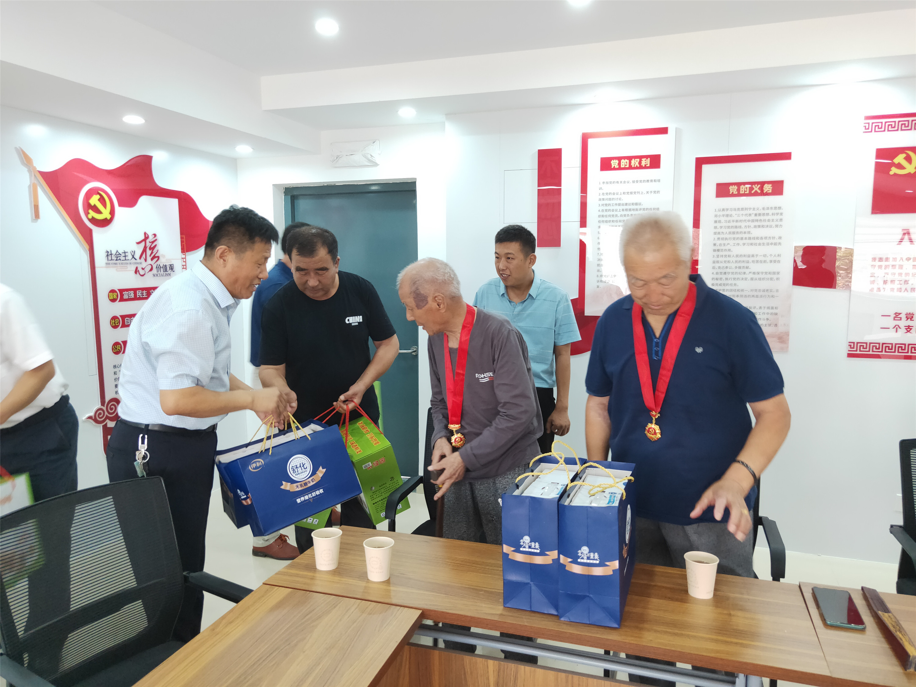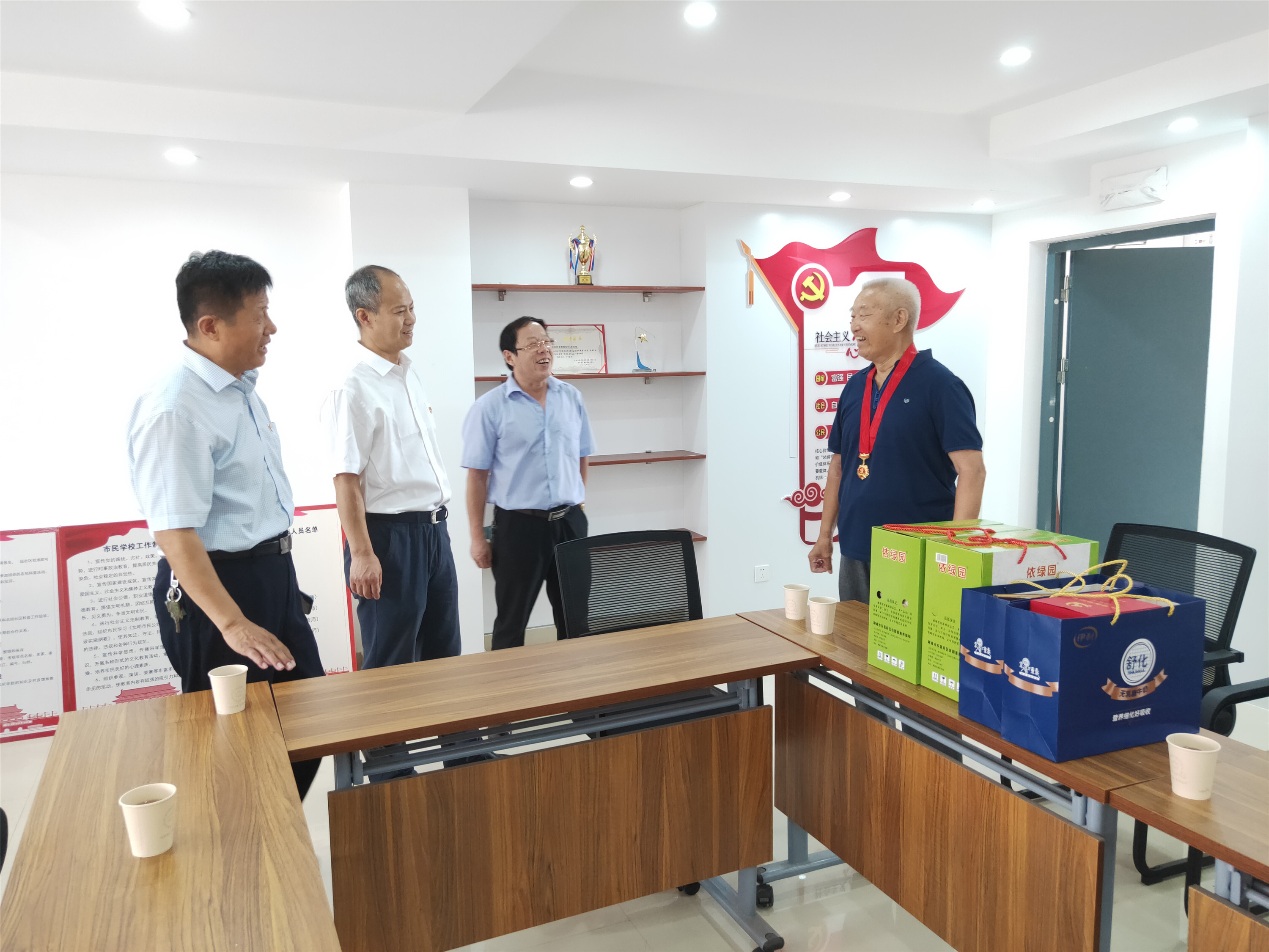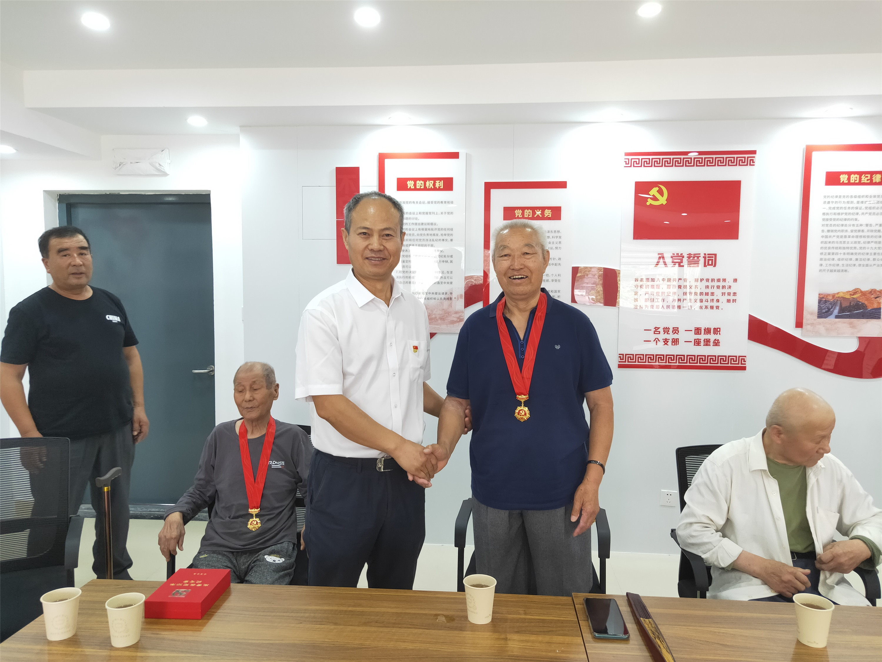 居住在平安社区的陈富岭、陈连坤、许成会、孙孟立、张美英等5名老党员,截至今年7月1日党龄均超过50年。在平安社区党群服务中心,陈景山、姜国峰与社区工作人员共同为五名老党员颁发“光荣在党50年”纪念章,向老党员同志们送去节日的祝福和崇高的敬意,并与老党员们进行了座谈交流,了解老党员的思想、生活和身体状况,仔细询问当前需要解决的困难和问题,弘扬爱老敬老的中华传统美德,让老党员感受到党组织的关怀和温暖,学院还为老党员送去了牛奶、鸡蛋等慰问品。老党员们非常感谢学院和社区的关怀,纷纷表示要继续发挥余热,坚定理想信念,牢记殷切嘱托,听党话,感党恩,永远跟党走。