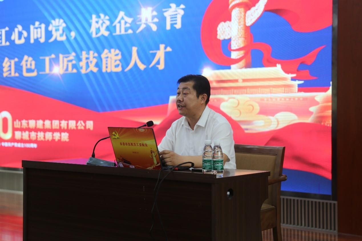 为庆祝中国共产党成立100周年,推进党史学习教育向合作企业延伸,与企业共育红色工匠人才,6月30日,学院招生办公室党支部书记王庆刚到聊建集团开展“红心向党,校企共育红色工匠”党史学习教育宣讲活动。