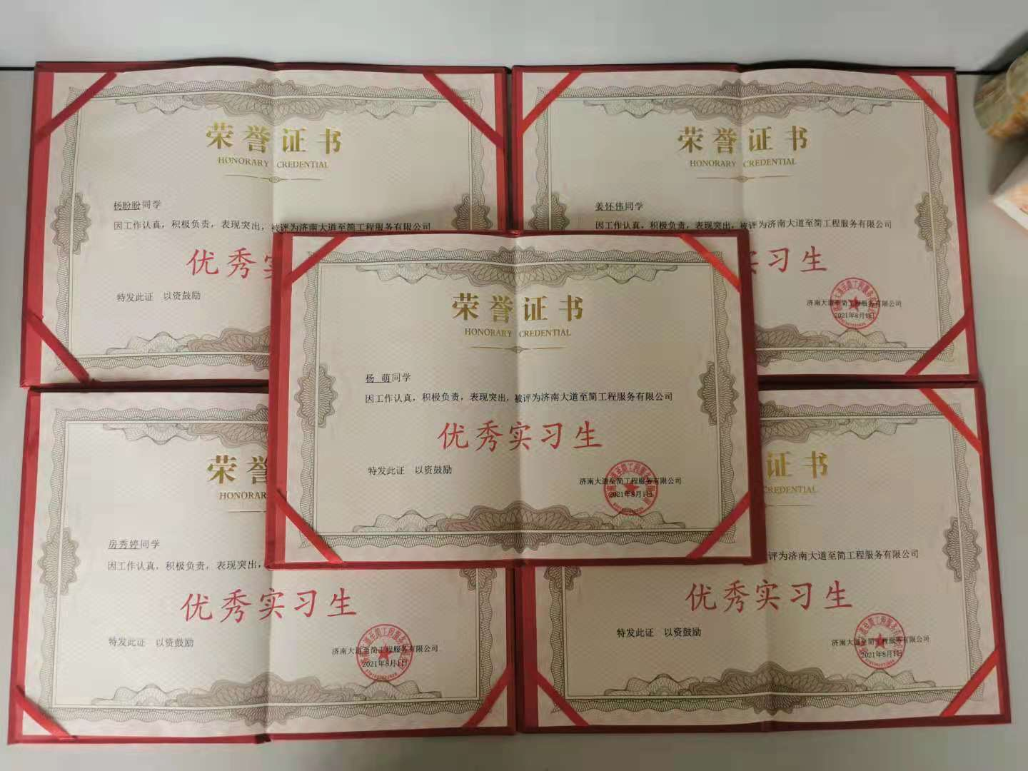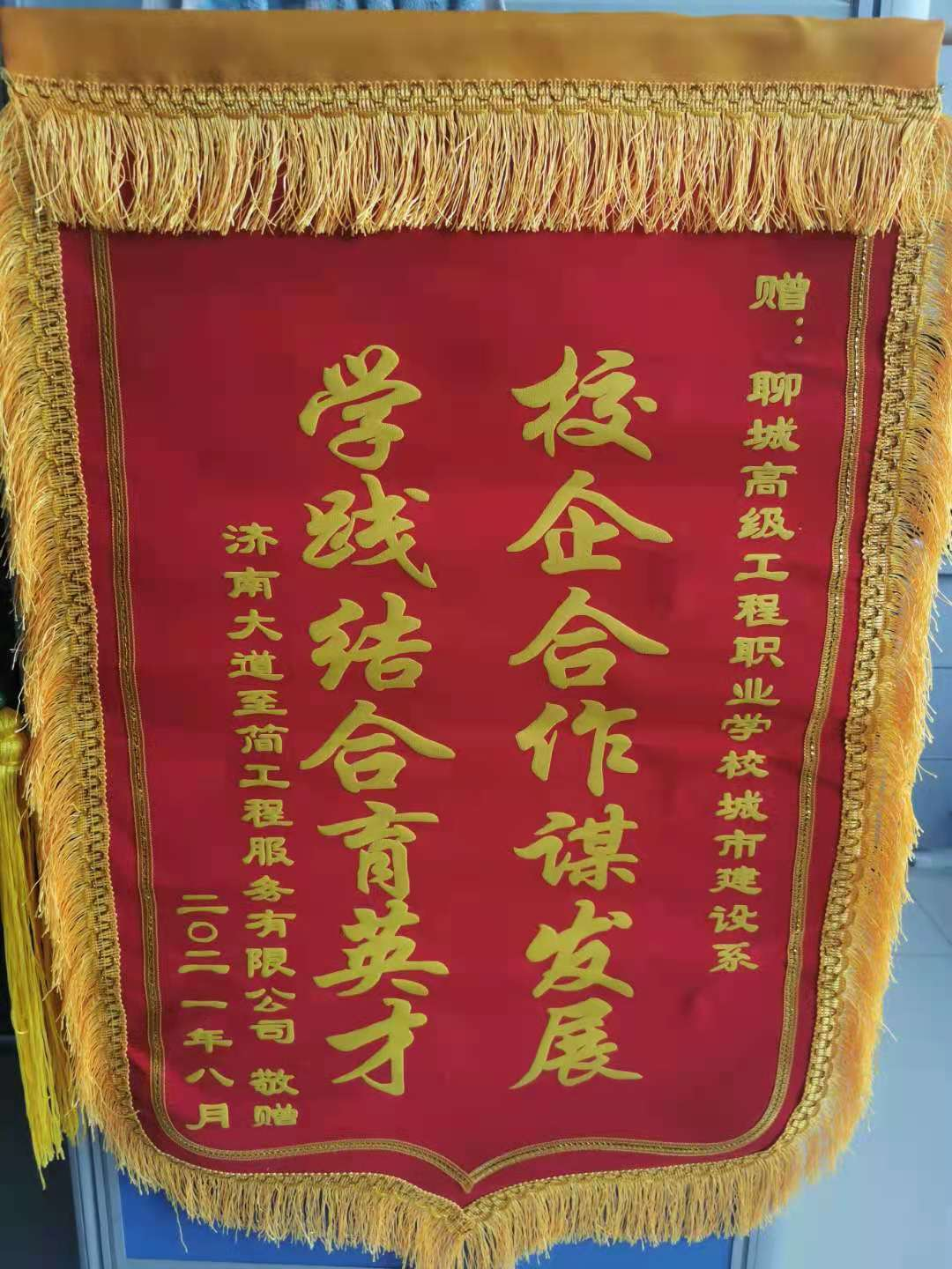 校企合作谋发展,学践结合育英才。8月26日,济南大道至简工程服务有限公司给学院送来锦旗、荣誉证书及奖金。城市建设系2018级工程造价专业杨盼盼等五名学生在实习期间,爱岗敬业、尽职尽责,得到实习单位一致认可,获得“优秀实习生”称号。