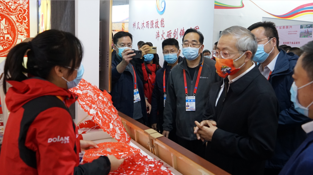 在活动现场,社团学生武天仪等现场展示“石榴花开”团花、“天下第一福”等剪纸作品吸引了来自全国各地观众的驻足。 人力资源社会保障部党组成员、副部长汤涛来到展位前与学生亲切交流,当听说眼前这些剪纸作品全部是由同学们在业余时间创作的,而且剪纸创作需要耐心、细心时,汤涛对同学们的出色表现表示赞赏。