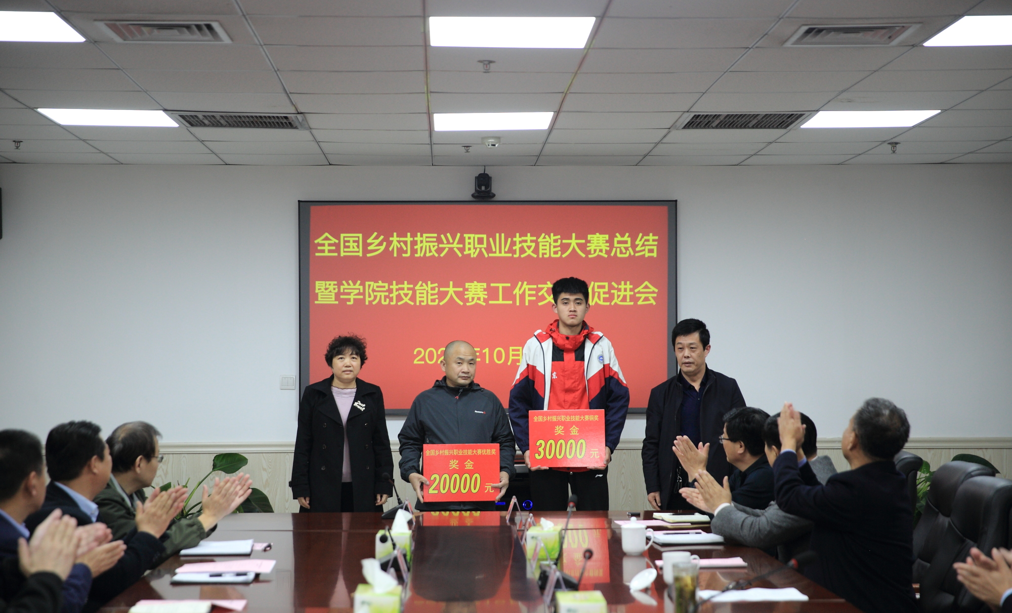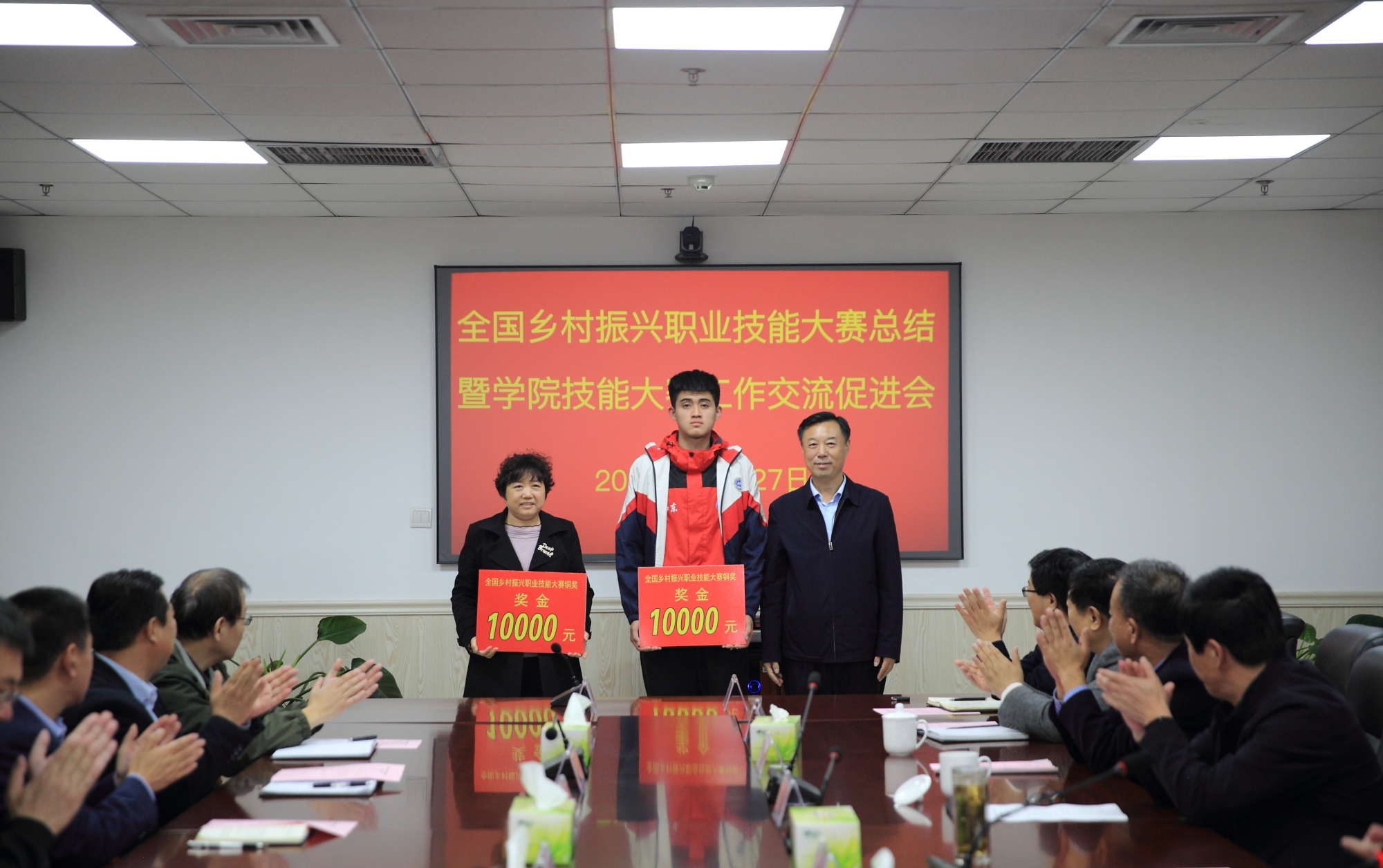 会议通报了全国乡村振兴职业技能大赛成绩、宣读政府贺信和表扬决定,闫学忠代表聊城市人社局为学生组铜奖获奖选手于传新及指导教师冯焕芹颁发奖金3万元;为职工组优胜奖获得选手单金瑞及指导教师冯焕芹颁发奖金2万元。张连臣代表学院分别为获奖选手于传新和指导导教师冯焕芹颁发奖金各1万元。