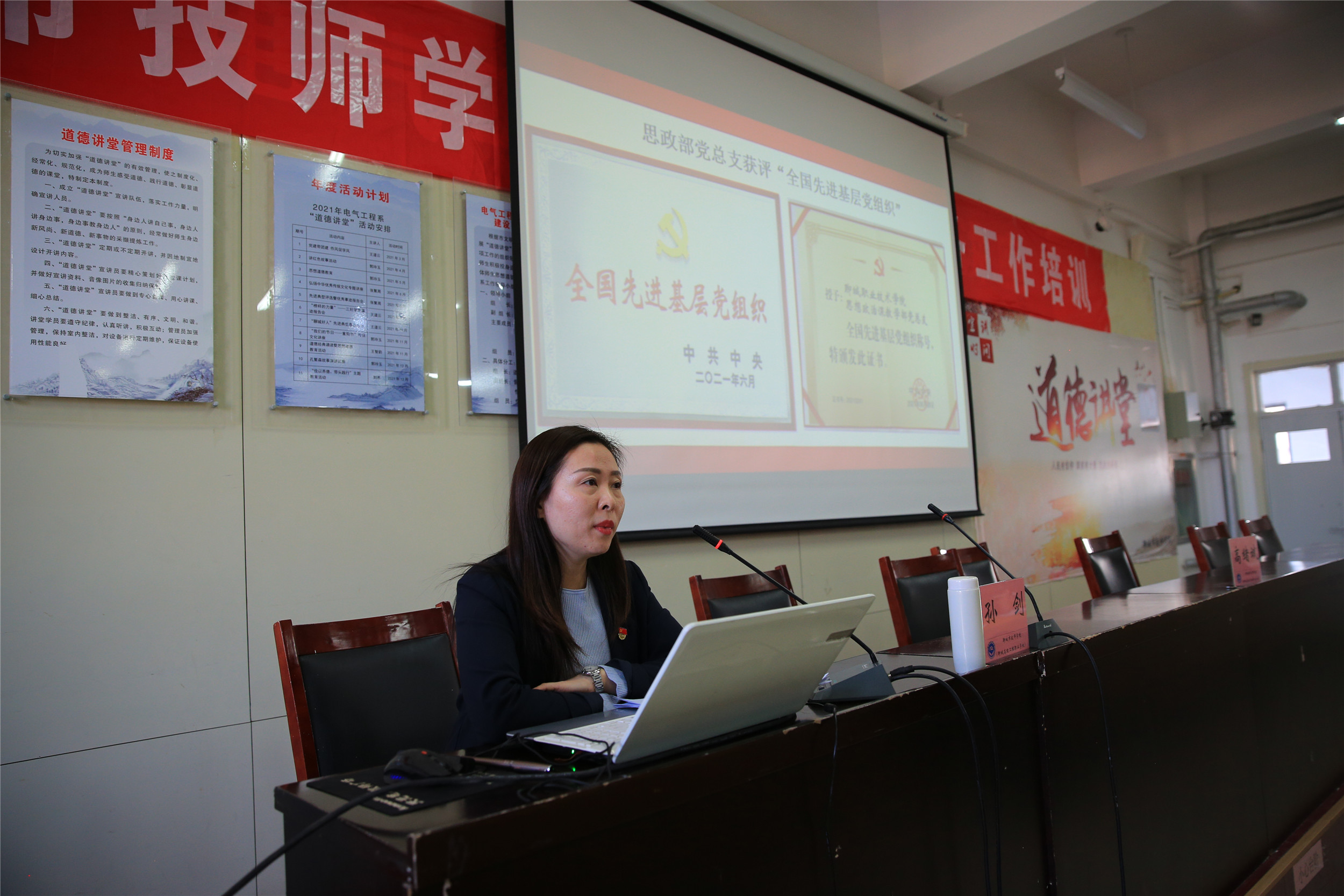 11月12日下午,来自“全国先进基层党组织”聊城职业技术学院马克思主义学院党总支书记孙剑,应邀走进聊城市技师学院,为27个党支部书记、支部委员及党务工作者共计85人,带来党建品牌创建经验分享。