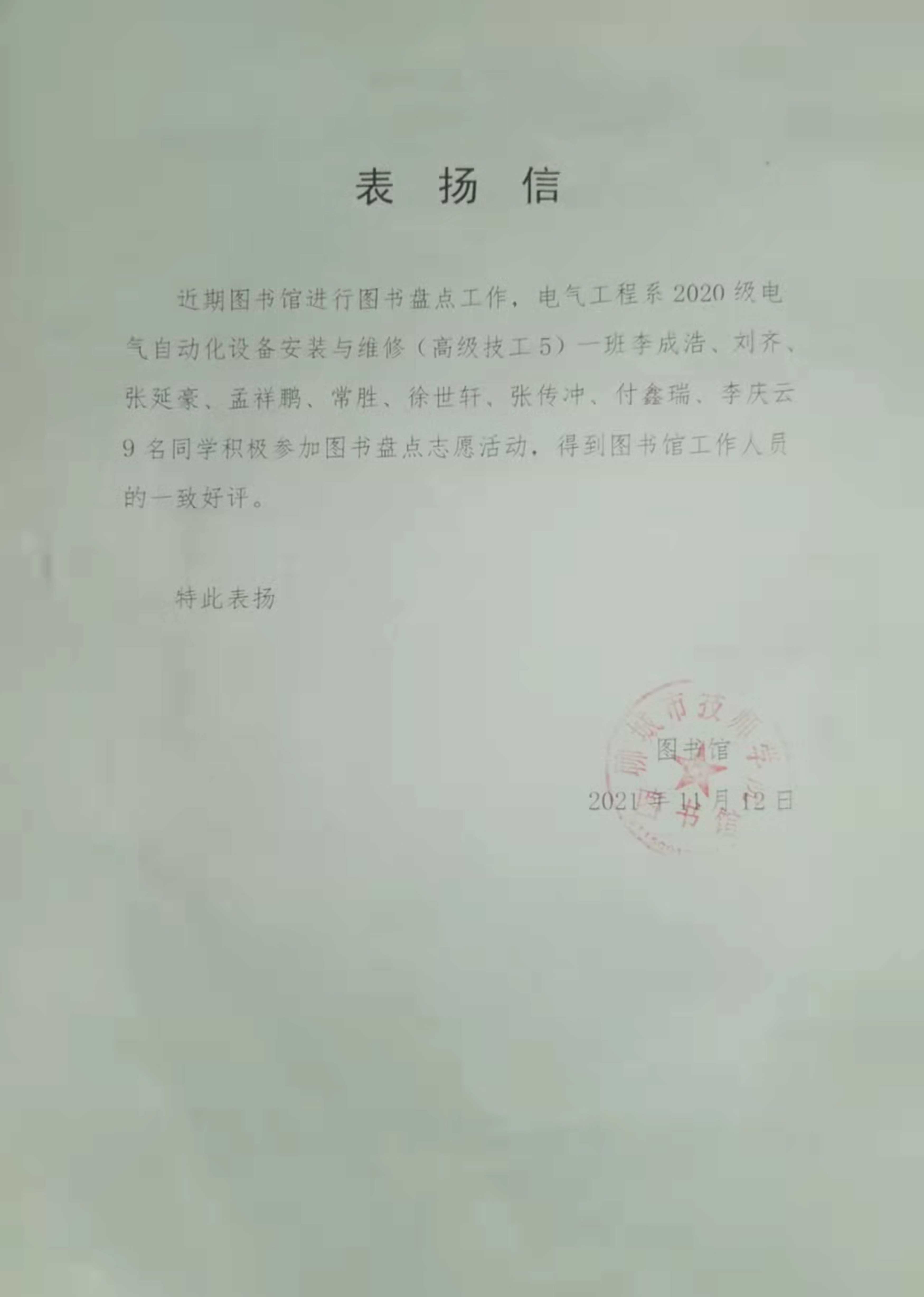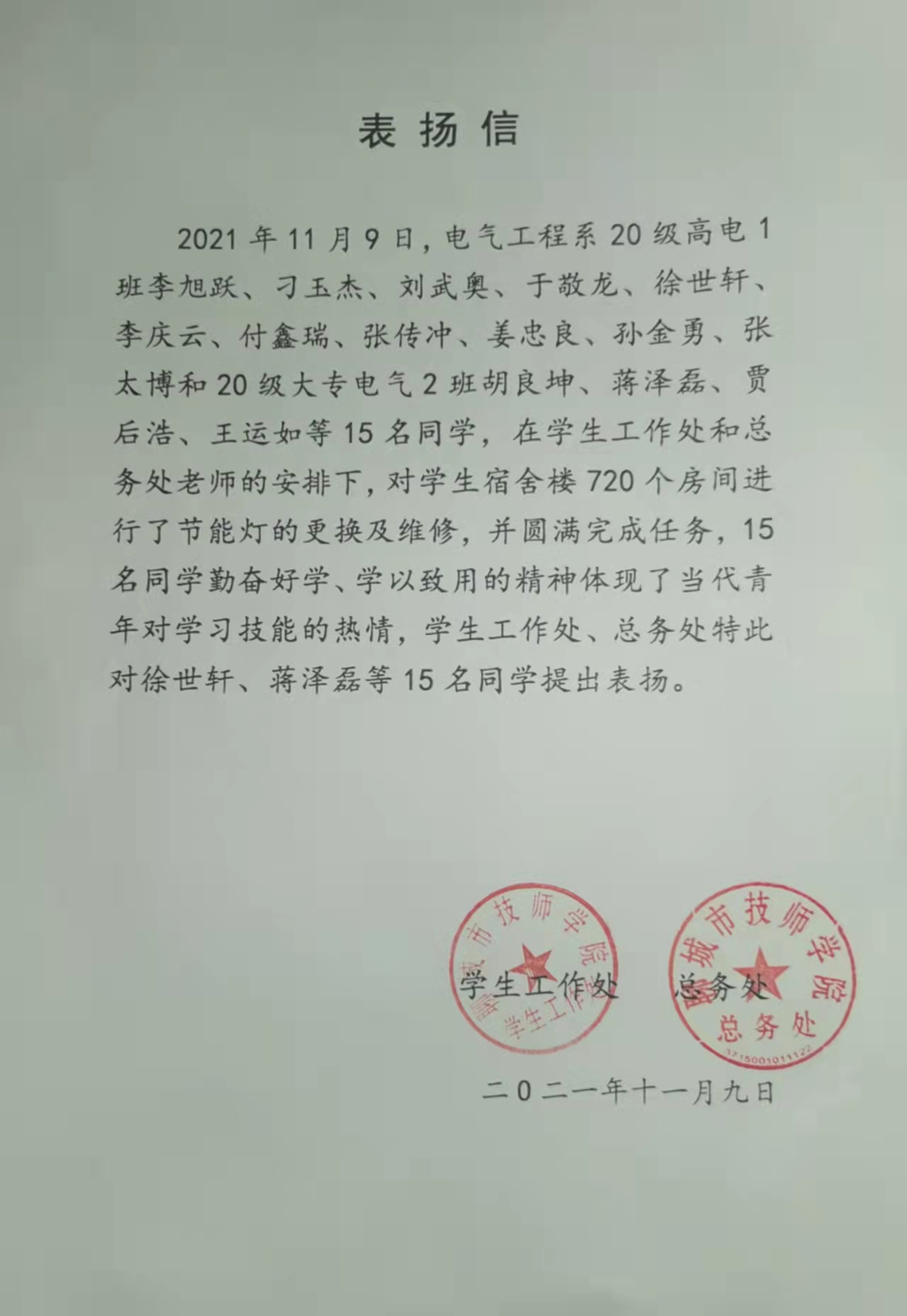 “15名同学勤奋好学、学以致用的精神体现了当代青年对学习技能的热情,学生工作处、总务处特此对徐世轩、李旭跃、蒋泽磊等15名同学提出表扬。”近日,一封表扬信送到了电气工程系团总支办公室。这15名同学在劳动周期间,协助学工处和总务处对学生宿舍楼720个房间进行了节能灯的更换及维修,圆满完成了任务。