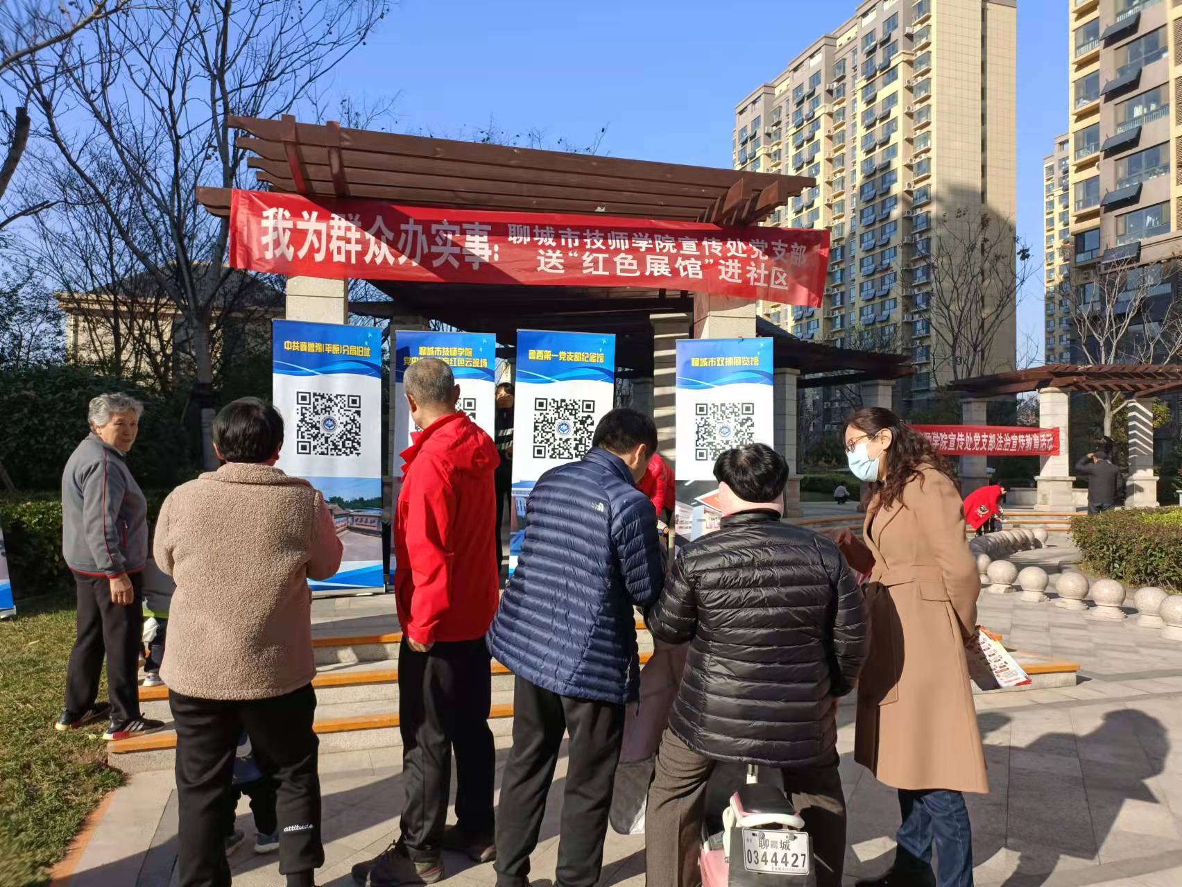 12月4日,聊城市高新区九州国际小区内格外喜庆,聚在广场里小区居民拿出手机扫码上网,在网上游览“红色展馆”,尽情分享由聊城市技师学院宣传处党支部送“红色展馆”进社区活动带来的便利。