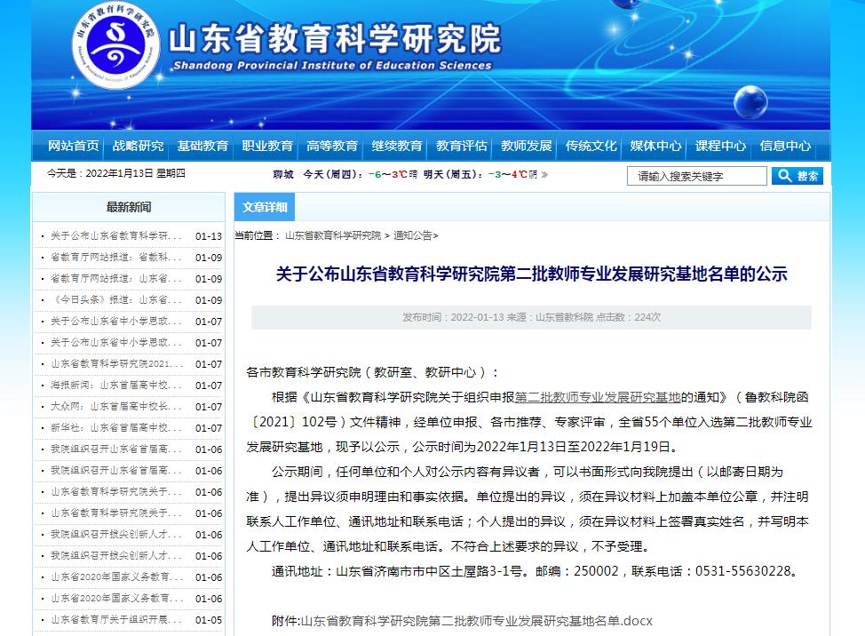 1月13日,山东省教育科学研究院传来喜讯,学院成功入选第二批教师专业发展研究基地。