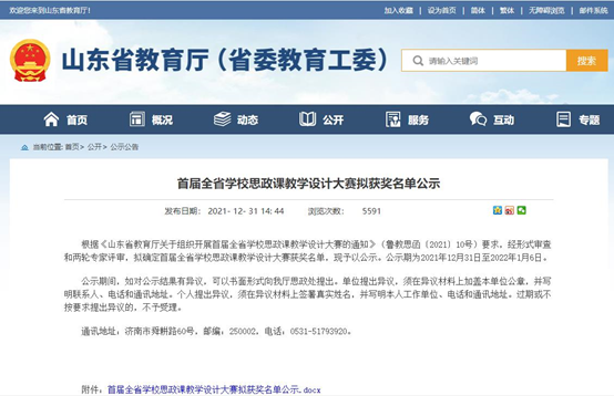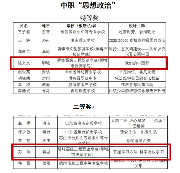 近日,山东省教育厅举办的“首届全省思政课教学设计大赛”结果揭晓,学院思政教研室陆文文以《我们的中国梦》出色设计获特等奖。