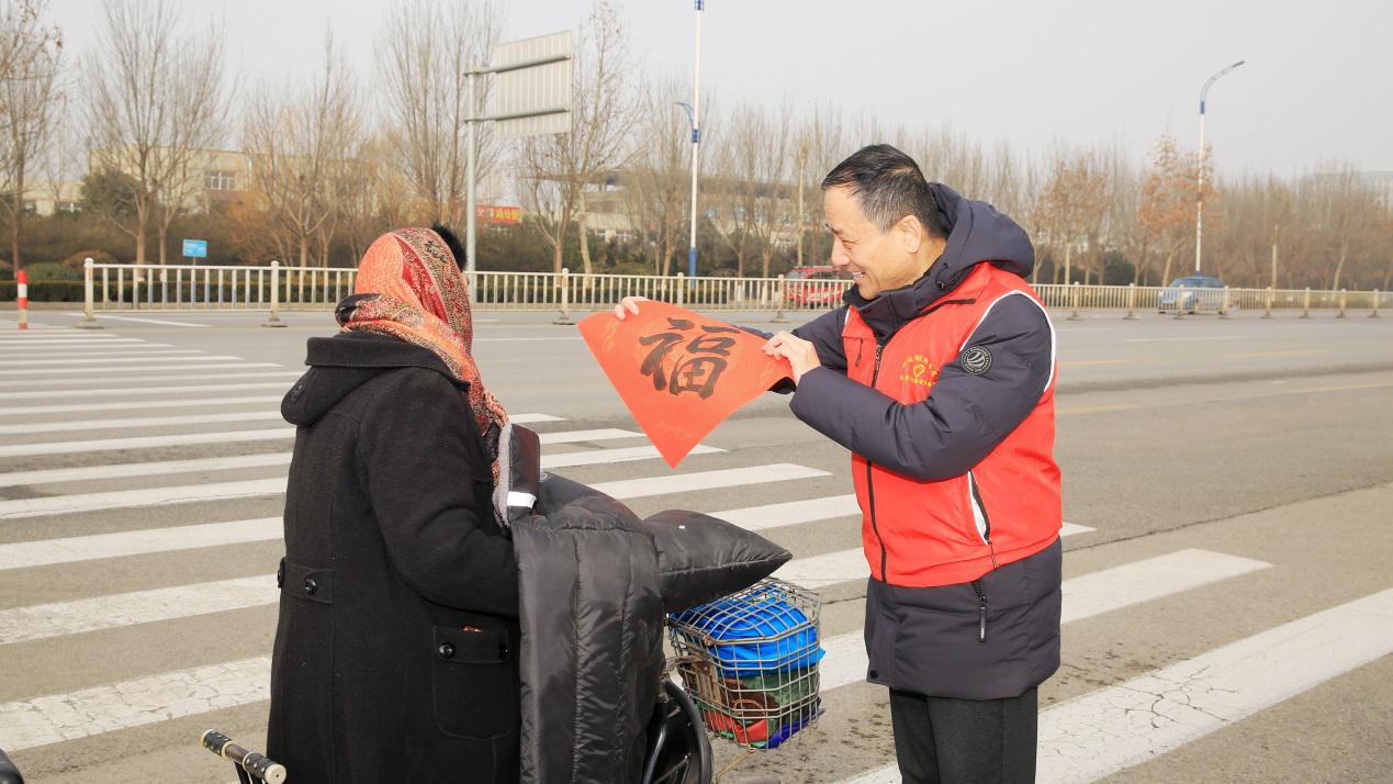 虽然天气寒冷,但活动现场气氛热烈。在活动现场,信息工程系党支部书记张朝程、民盟技师学院支部主委刘俊萍和其他参加活动的党员和盟员,将蕴含着喜庆与祝福的“福”字送到环卫工人、快递小哥和路人手中。大家拿到的这些“福”字,满载着暖暖的情谊。附近社区居民也闻讯陆续赶来,人们一边欣赏着自己心仪的“福”字,一边纷纷称赞这字儿写的好、活动搞得好。