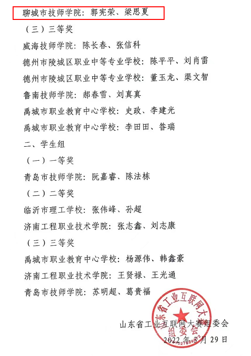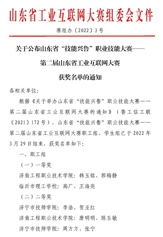 2022年3月29日,山东省“技能兴鲁”职业技能大赛-第二届山东省工业互联网大赛闭幕,智能制造系教师郭宪荣、梁思夏在大赛中荣获职工组二等奖。