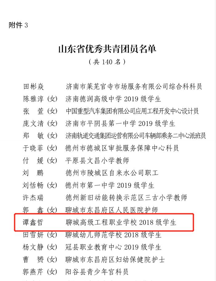 谭鑫哲在全国技能大赛、社会实践、志愿服务、学生会工作等各方面表现突出,处处起到表率作用,彰显出学院学生的良好素质,充分发挥了团员的先锋作用,获评“山东省优秀共青团员”。