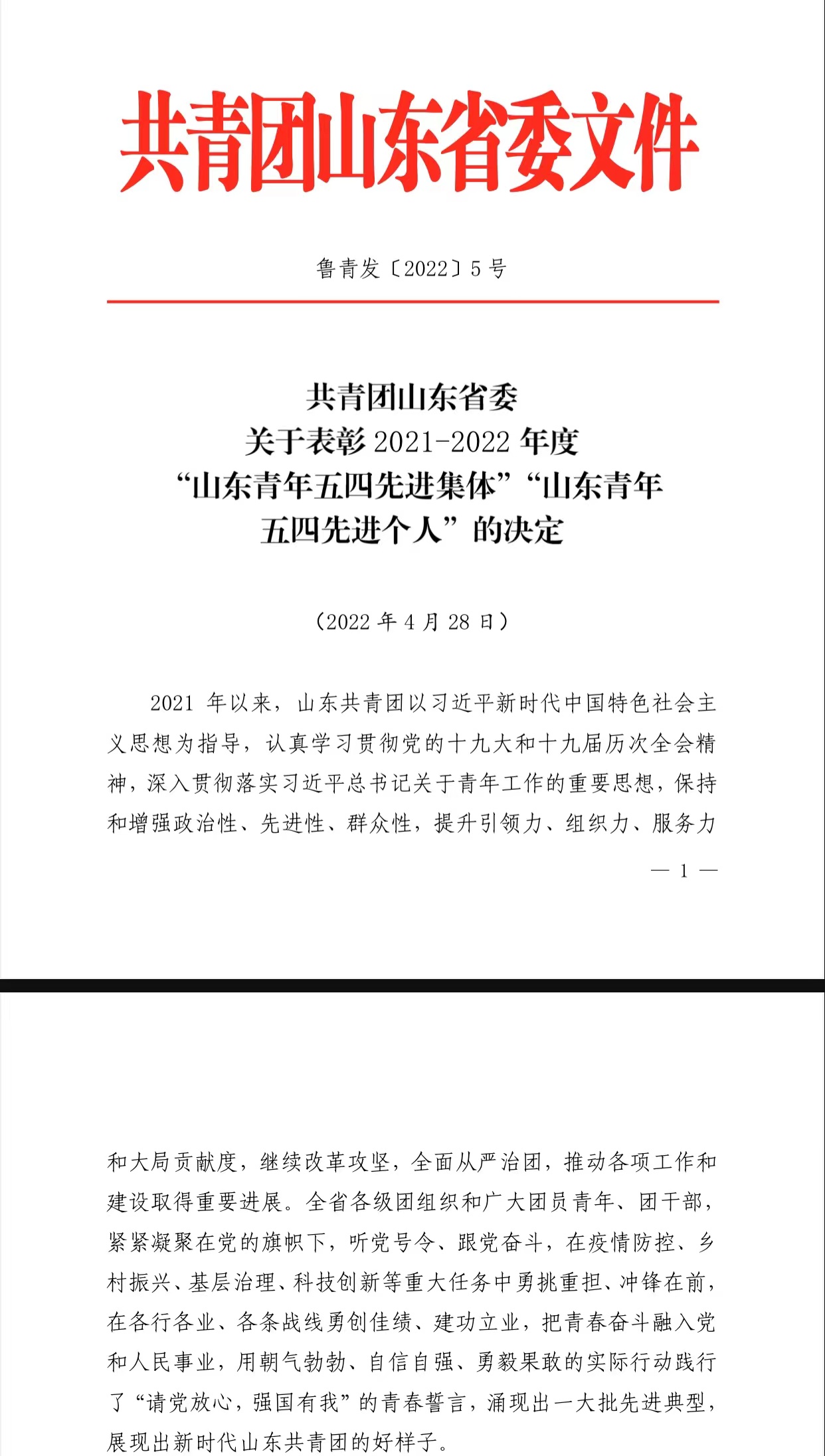 近日,共青团山东省委发布《关于表彰2021-2022年度“山东青年五四先进集体”“山东青年五四先进个人”的决定》,学院团委荣获“山东省五四红旗团委”,建筑工程系2018级学生谭鑫哲荣获“山东省优秀共青团员”。