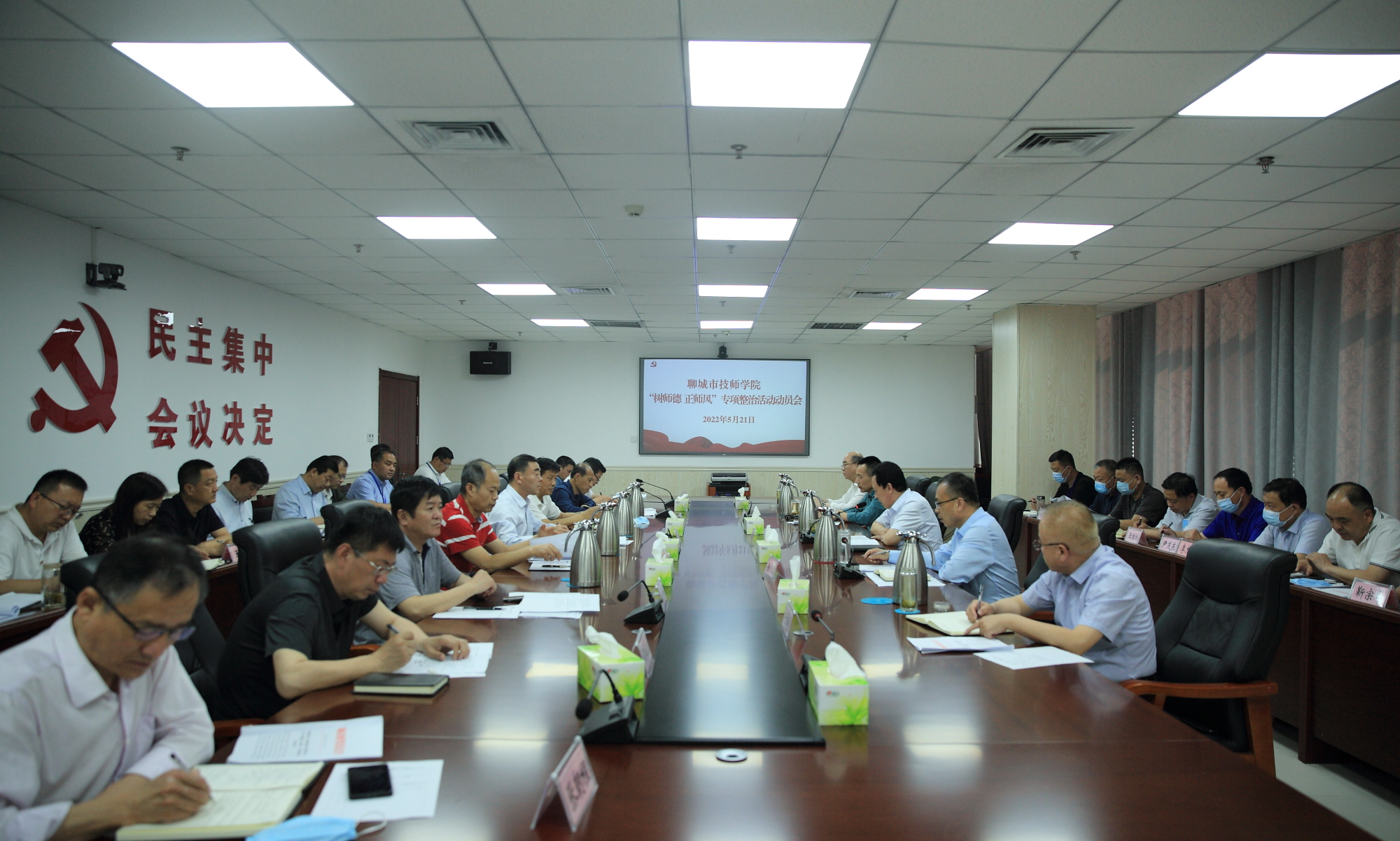 会议传达了省教育厅和市教体局“树师德 正师风”专项整治活动的通知、市教体系统实施方案,下发了学院该项整治活动实施方案。