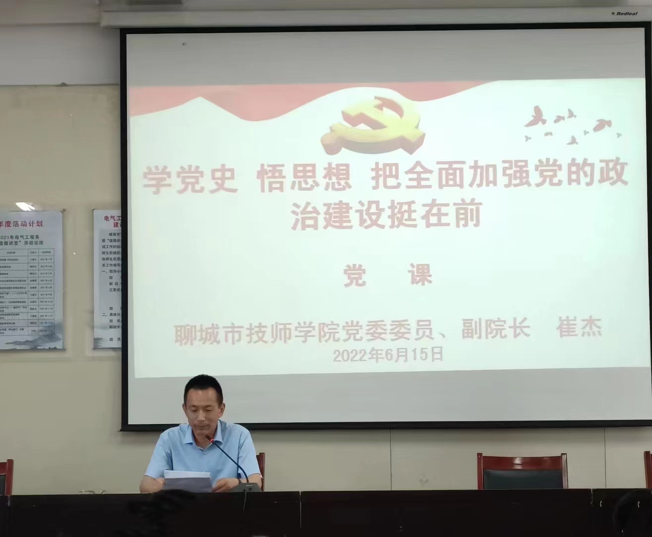 为推进党史教育常态化长效化,6月15日下午,学院党委委员、副院长崔杰在明志楼412连廊教室以《学党史、悟思想,把全面加强党的政治建设挺在前》为题,为学院办公室党支部、保卫处党支部、电气工程系党支部全体党员讲党课。