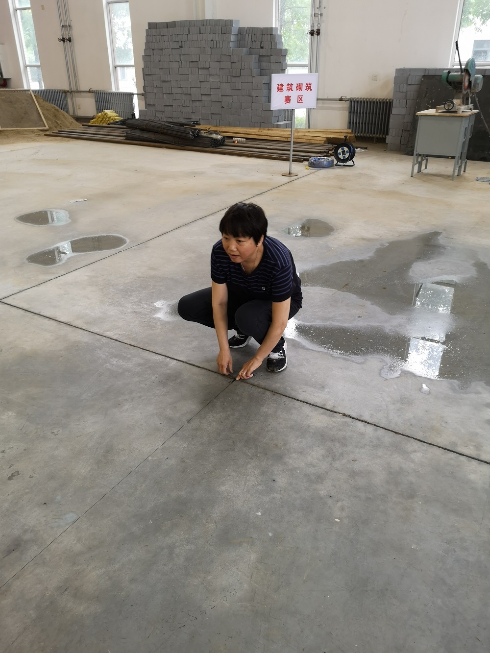 砌筑项目对墙体的尺寸、垂直度、平整度等多方面进行测量与打分,每1mm误差就扣除一定分值,超过规定毫米差则该检测点为零。为实现国赛上成绩的突破,冯焕芹对学生训练要求精度以“零误差”为标尺。冯焕芹经常告诫学生“高手过招,就在这毫米之争。”学生们每完成一项,冯焕芹都需要从各个角度进行检测、评分。腰痛没法弯腰,她只能尽量直立着下蹲。一次次的蹲下再起来,为了缓解疼痛,她就随身带着止疼药。